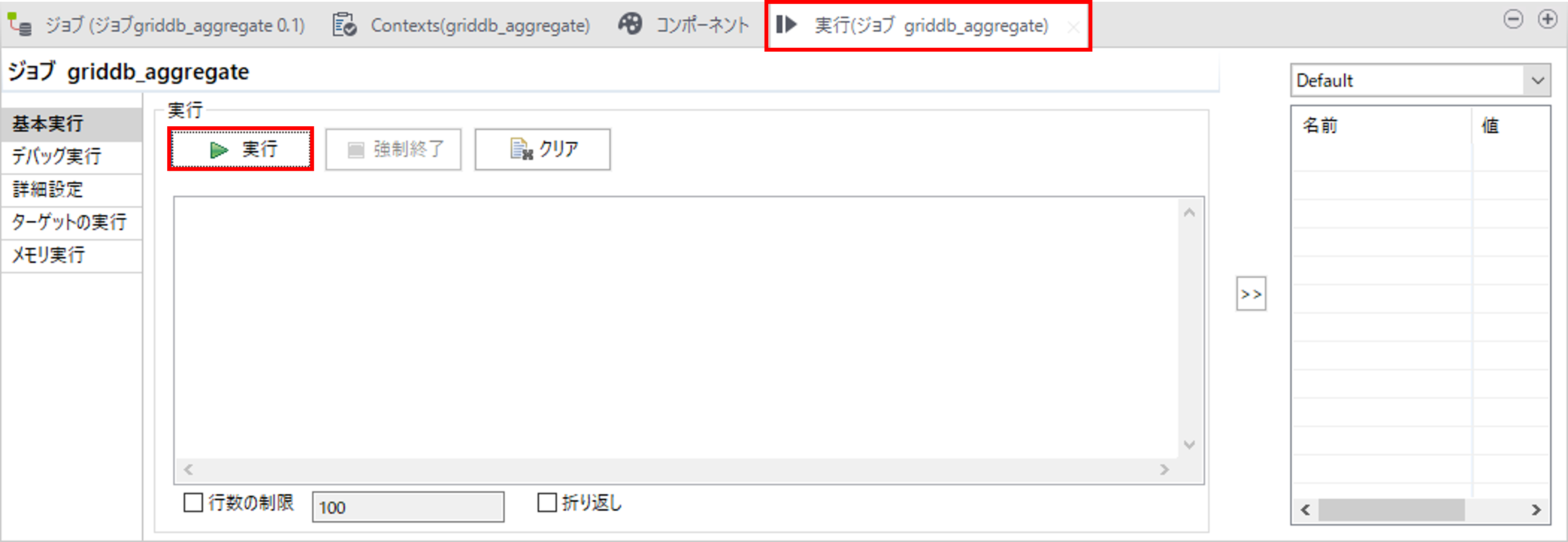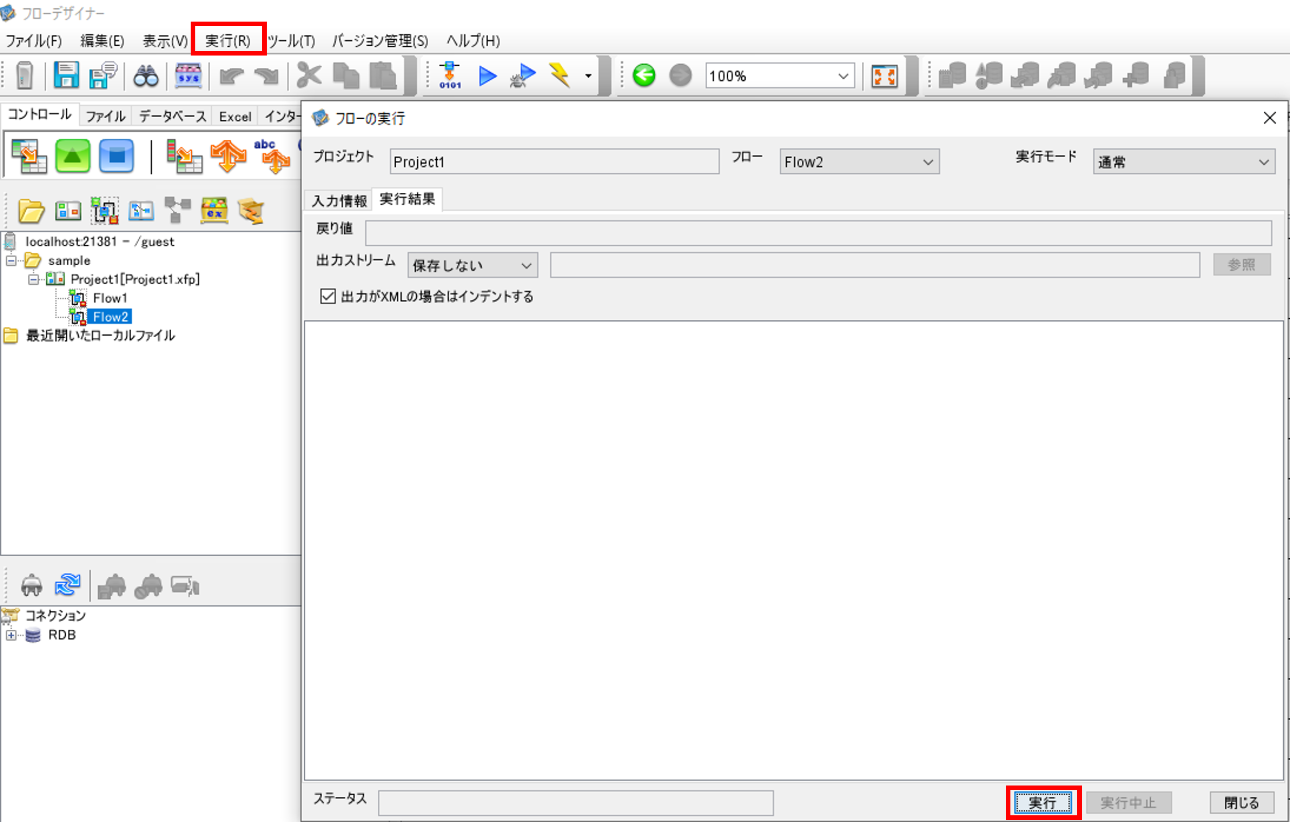 「実行」タブを選択して、「実行」ボタンを押して、実行を行います。