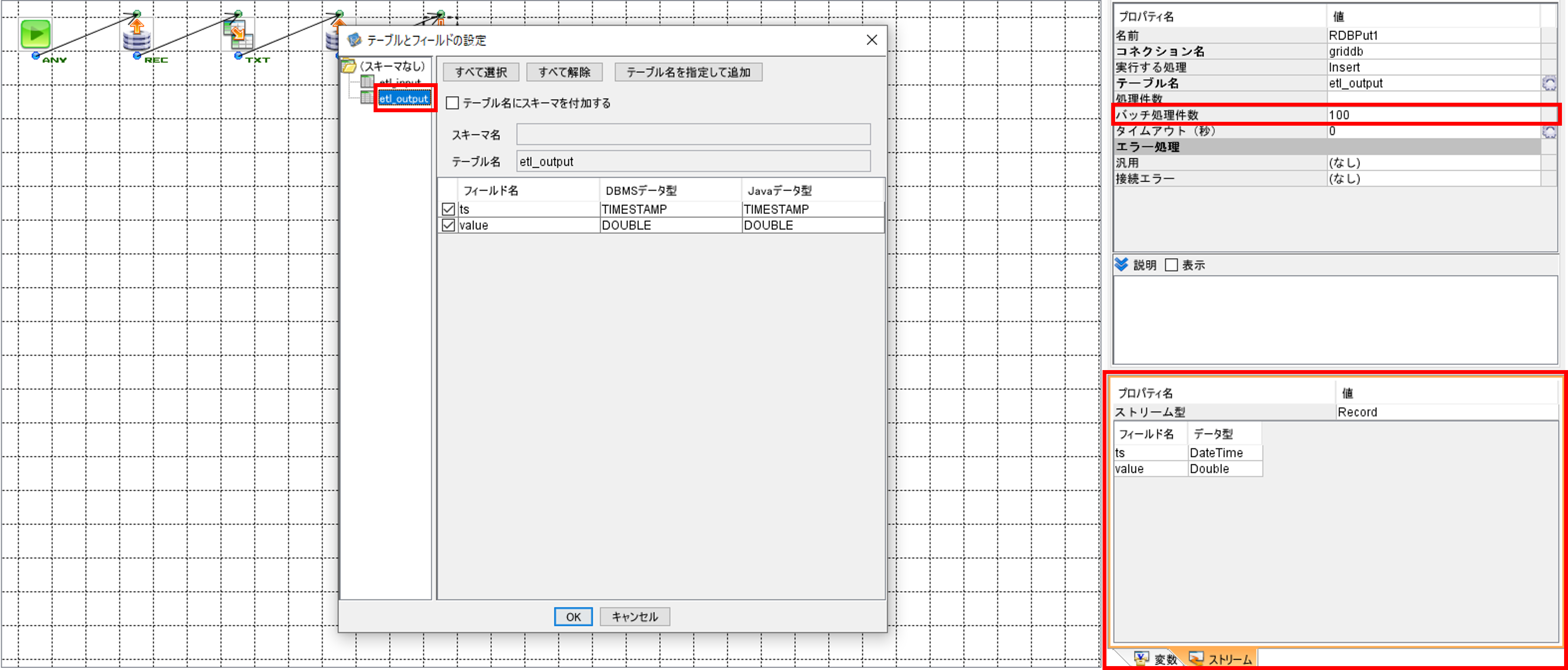 「接続コンポーネント」で①GridDBとのコネクションで作成したtDBConnectionコンポーネントを選択します。