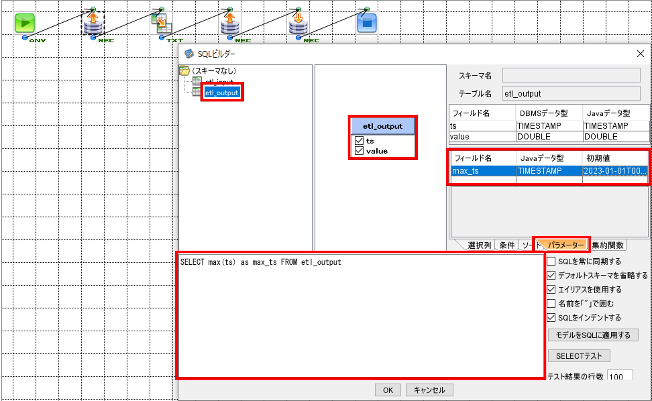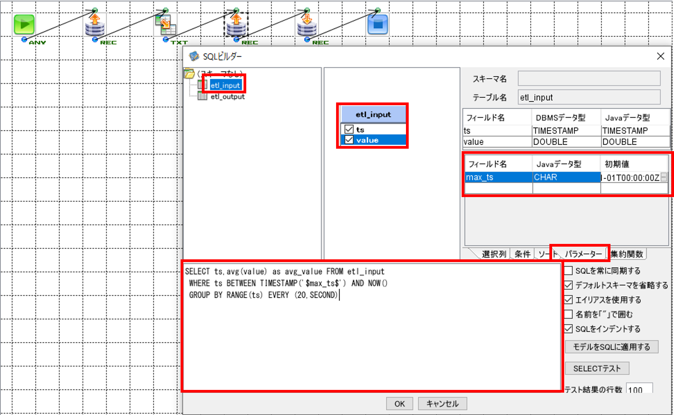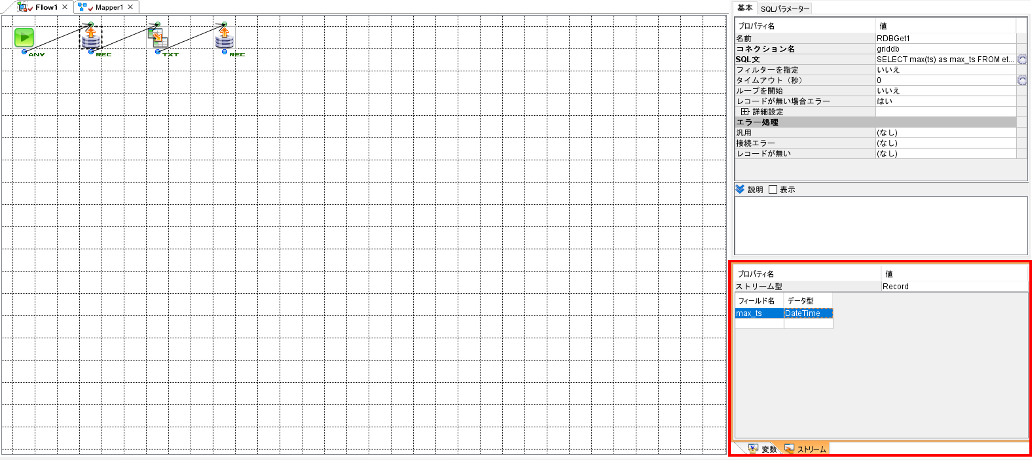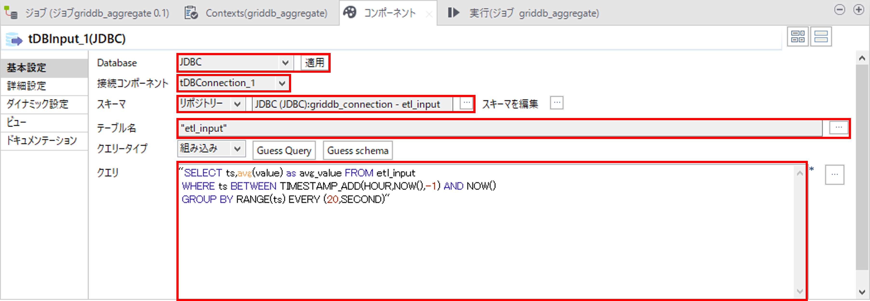 tDBInputコンポーネントでGridDBからクエリ条件を指定してデータを取得します。
