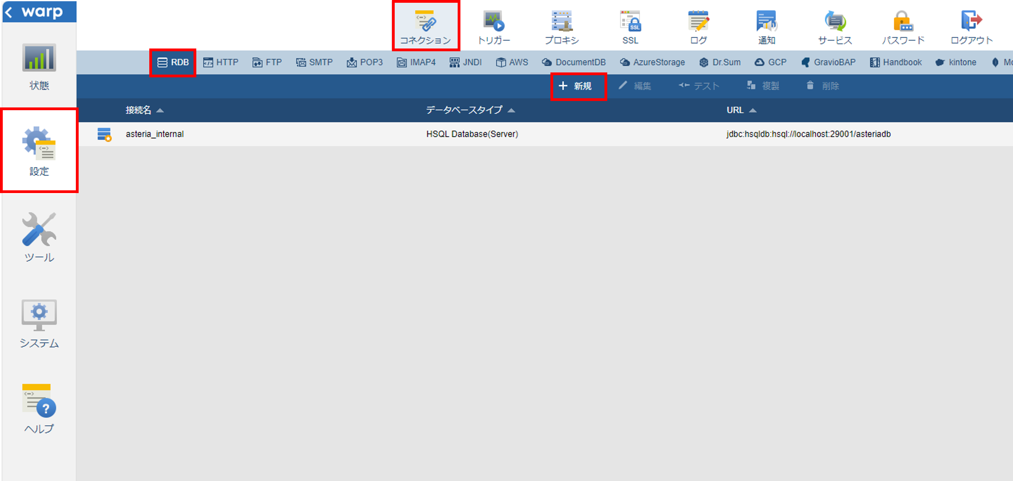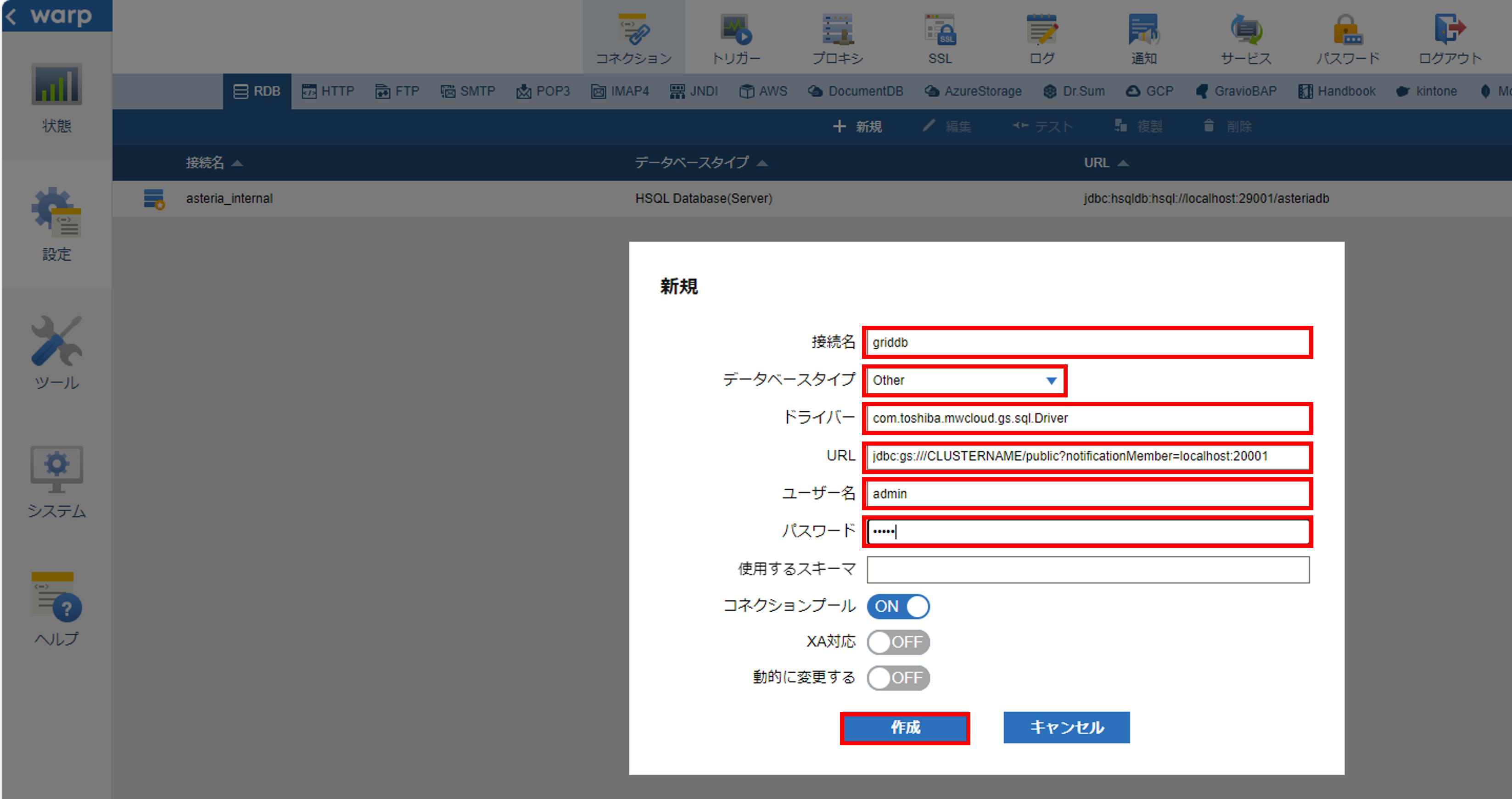 メタデータのDB接続で右クリックをして「接続を作成」を選択して、「データベース接続」画面を開きます。