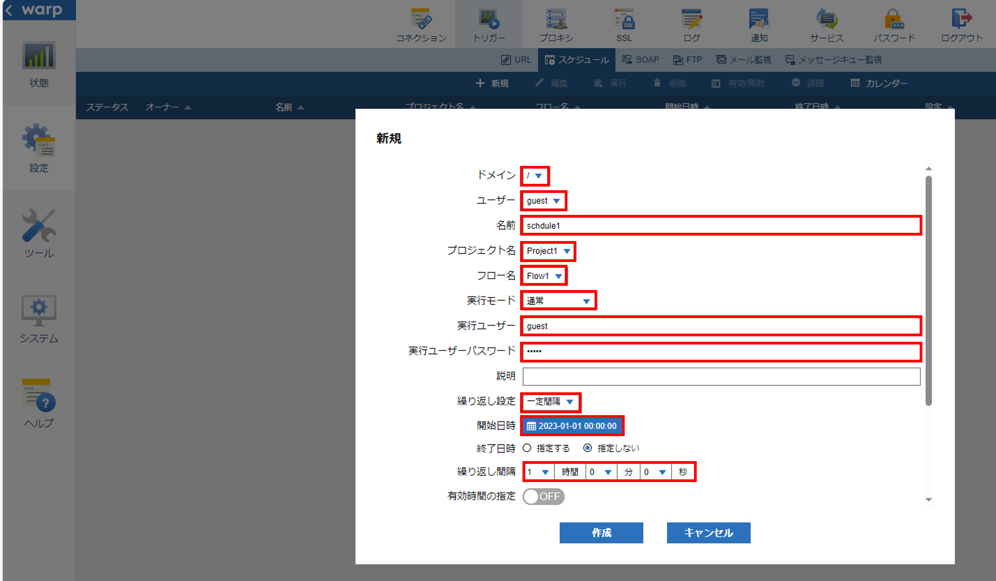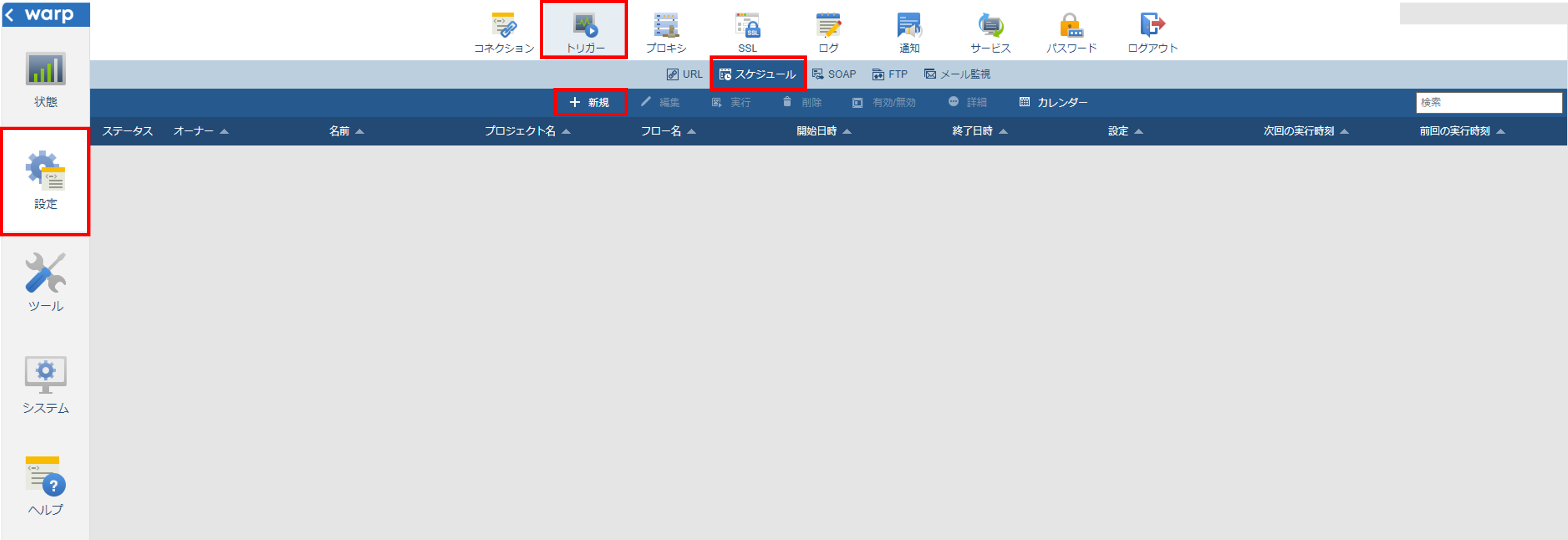 作成したフローをこのフローサービスで操作して、スケジュール実行・定期実行を設定します。