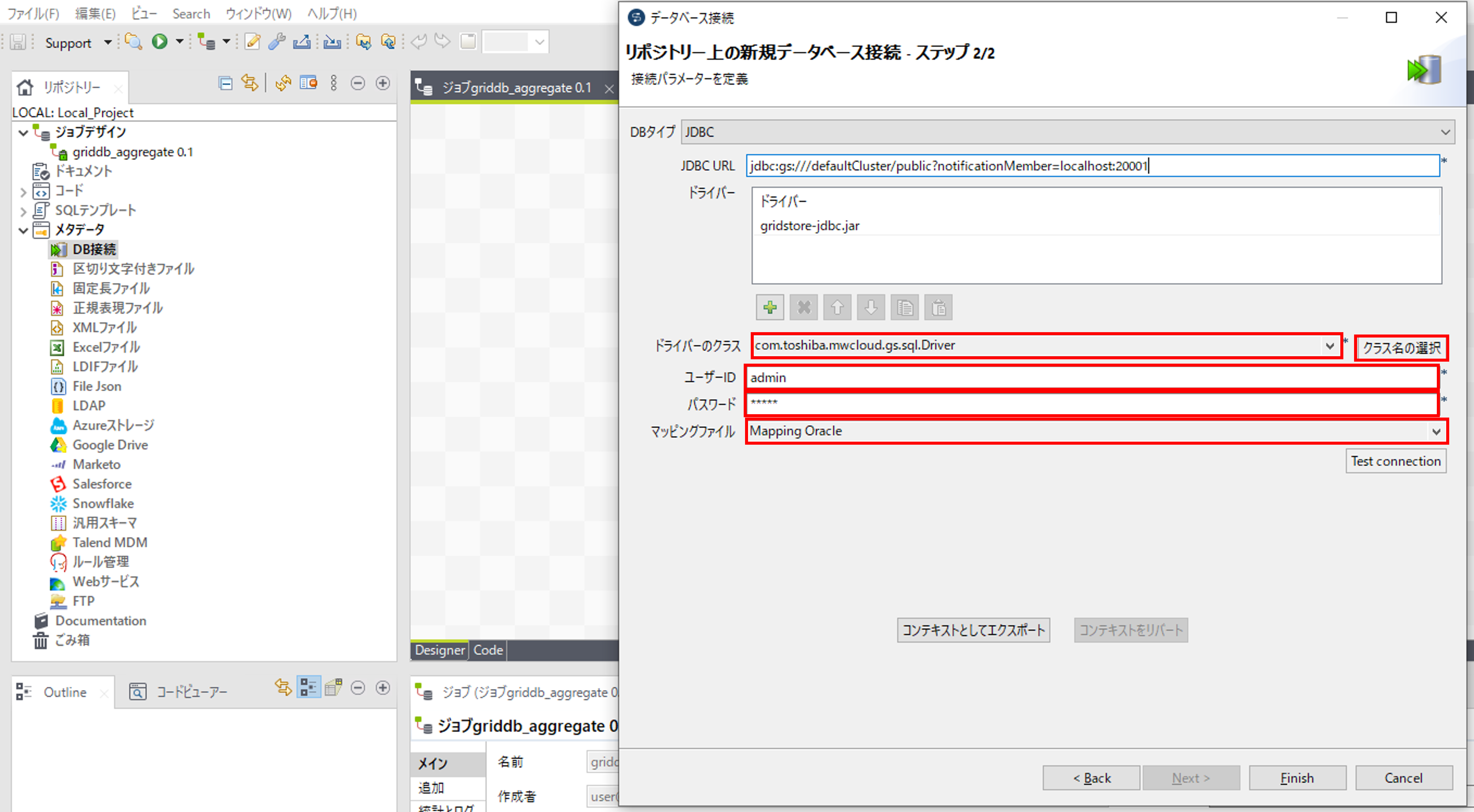 「ドライバのクラス」で「クラス名の選択」を押して、「com.toshiba.mwcloud.gs.sql.Driver」を追加します。「ユーザID」と「パスワード」にそれぞれGridDBの接続ユーザIDとパスワードを入力します。「マッピングファイル」で「Mapping Oracle」を選択して、データベースを作成します。