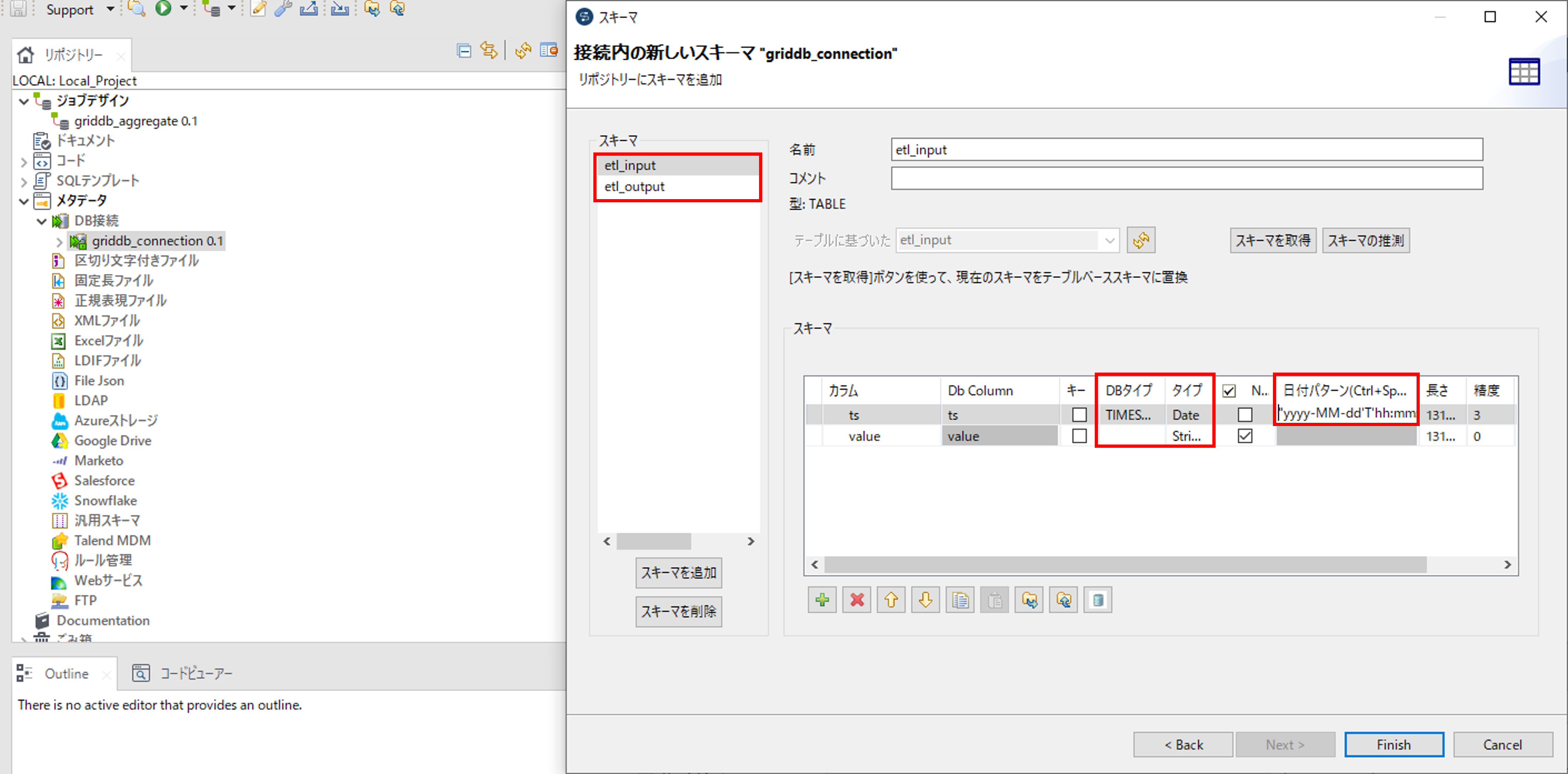 Talend Open StudioでGridDBのデータを集計して、集計結果をGridDBに出力する例を紹介します。GridDBとTalend Open Studioのデータ型のマッピング