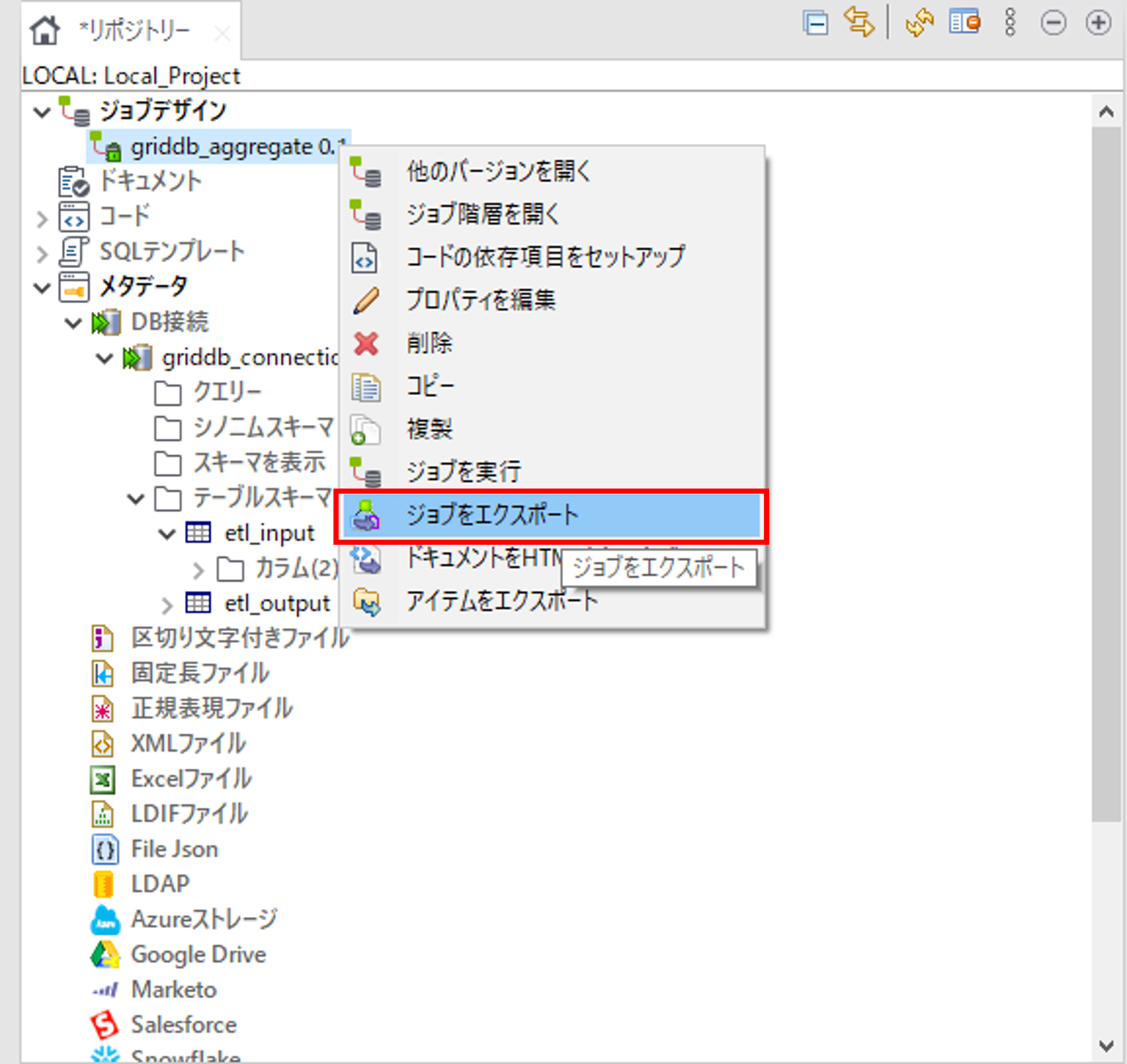 ジョブデザインの作成したジョブで右クリックをして「ジョブをエクスポート」を選択して、「ジョブをエクスポート」画面を開きます。