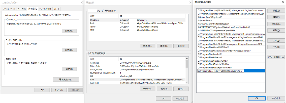 C:\Program Files (x86)\TOSHIBA\GridStore\binを追加します。