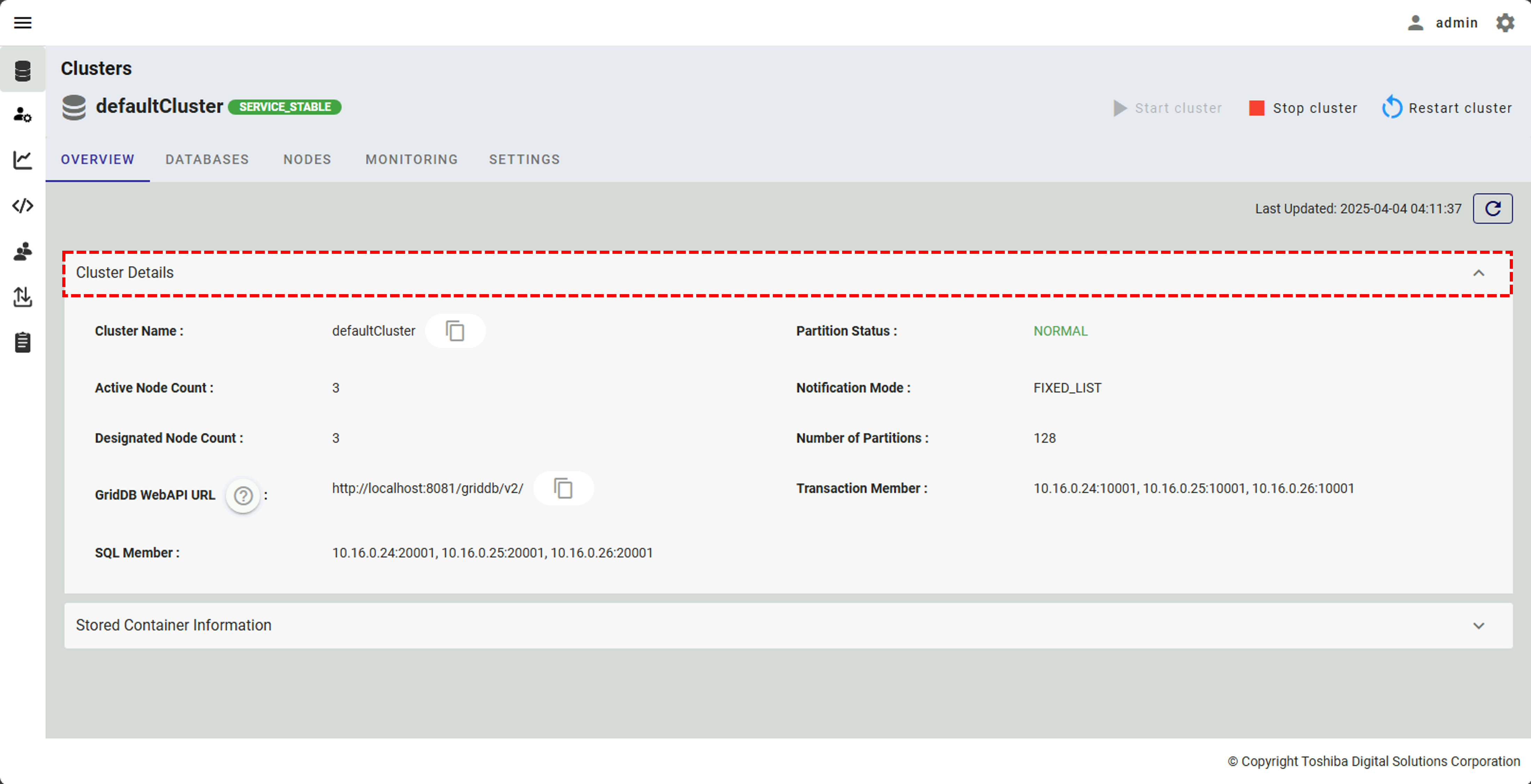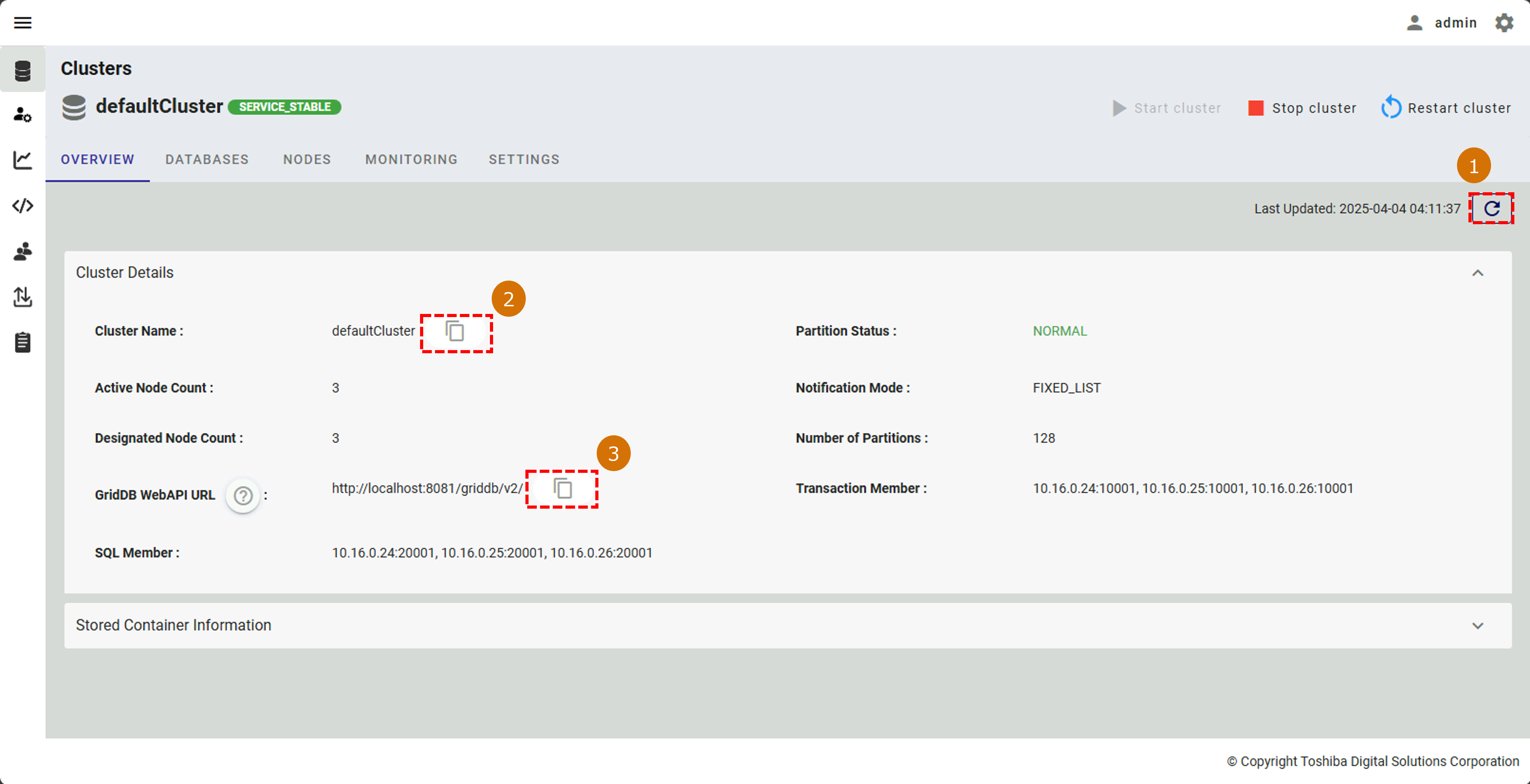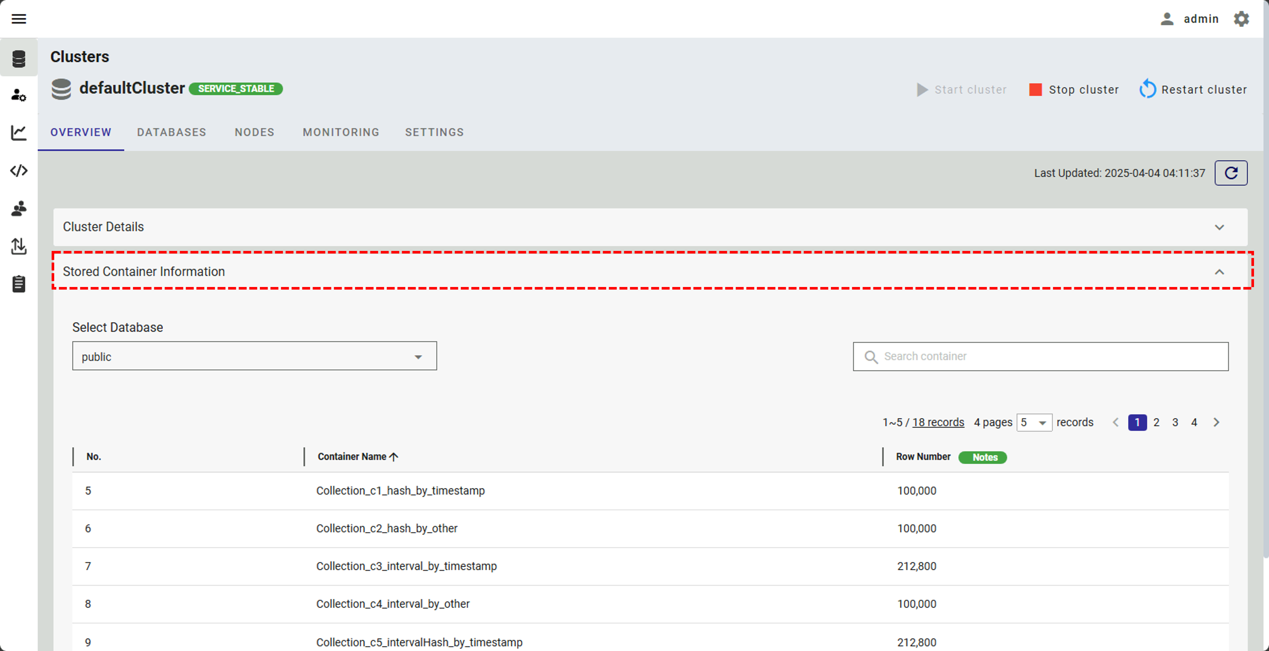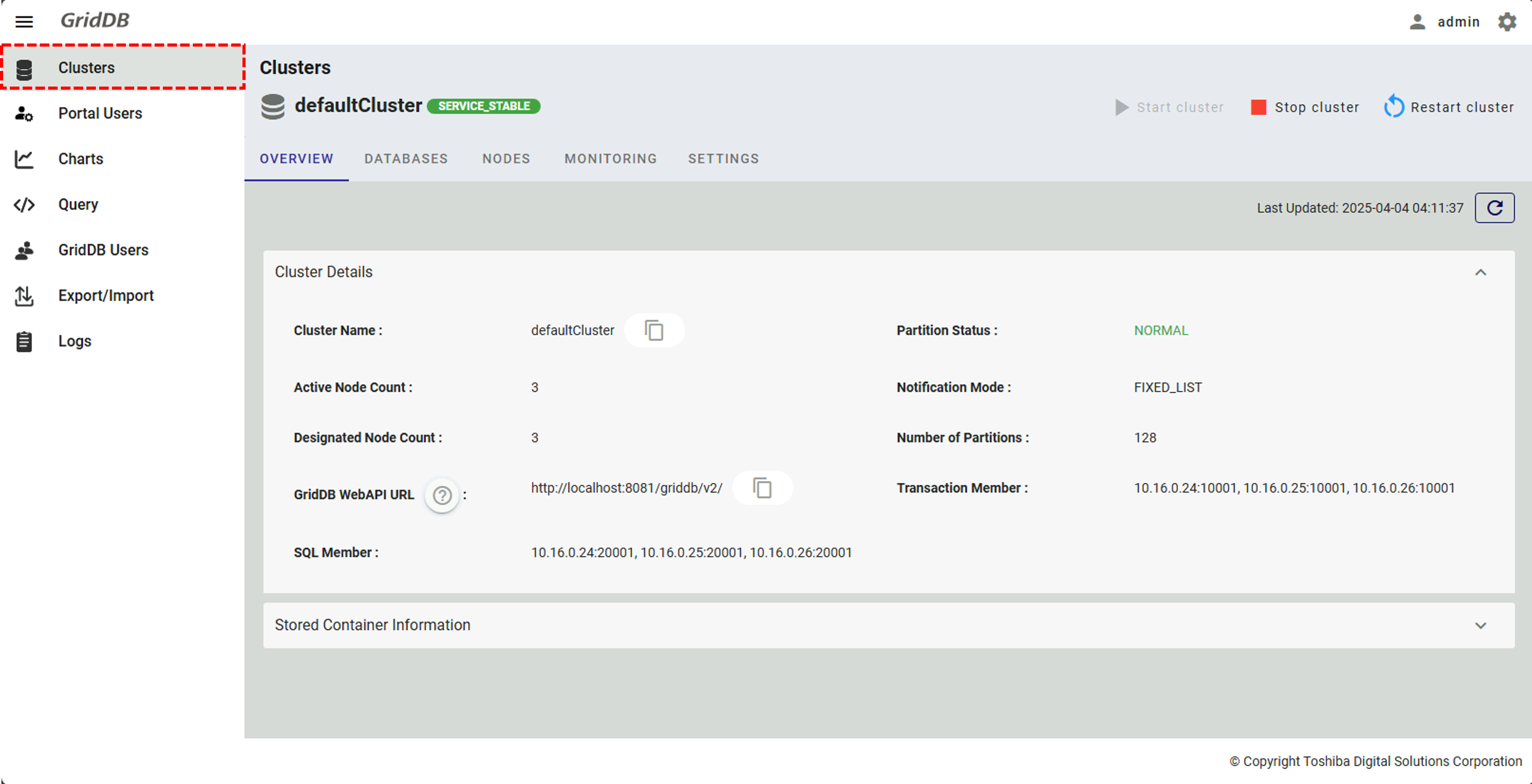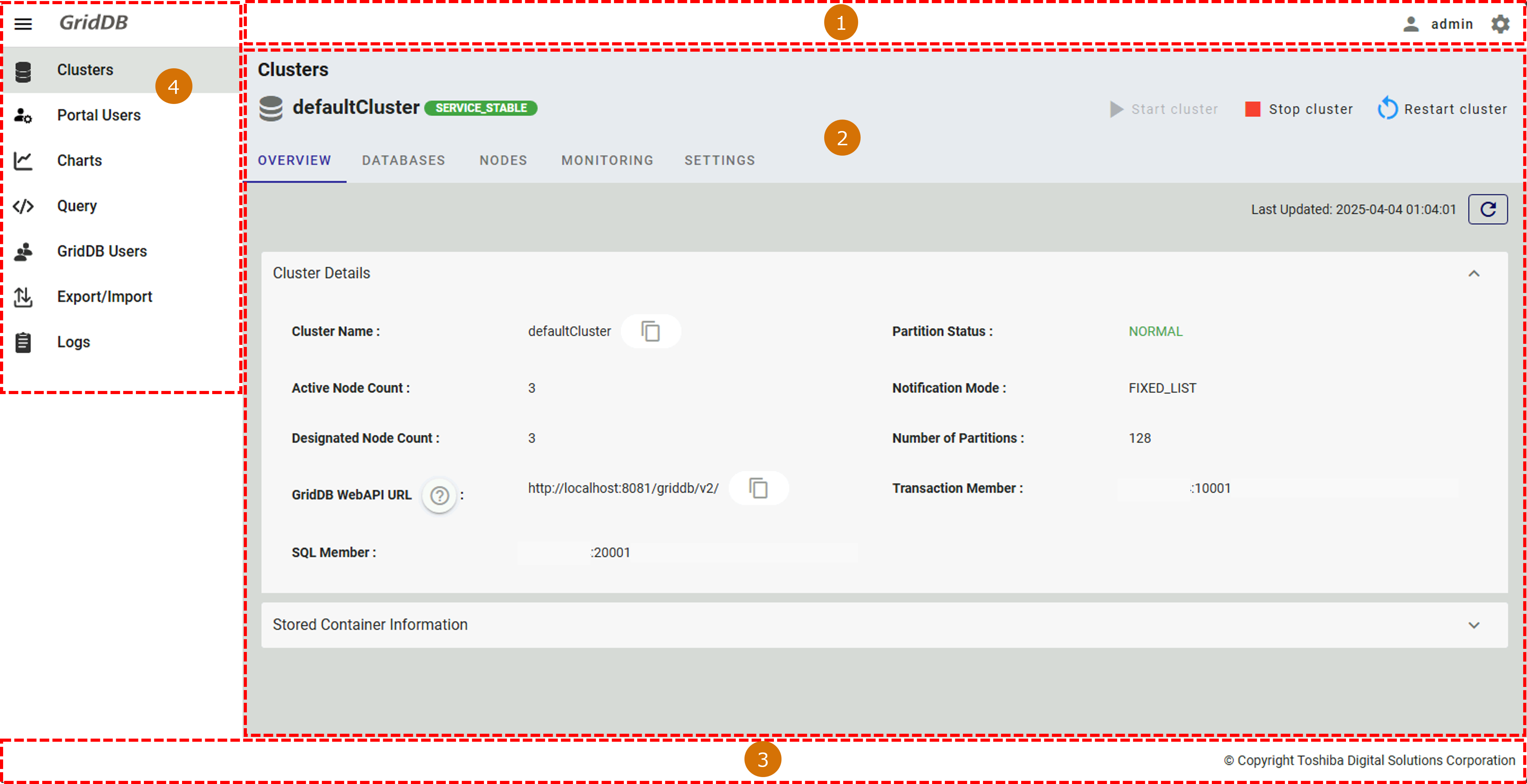 統合運用管理GUI(gs_admin) GridDBクラスタの運用機能を統合した、Webベースの統合運用管理GUI(gs_admin)について説明します。