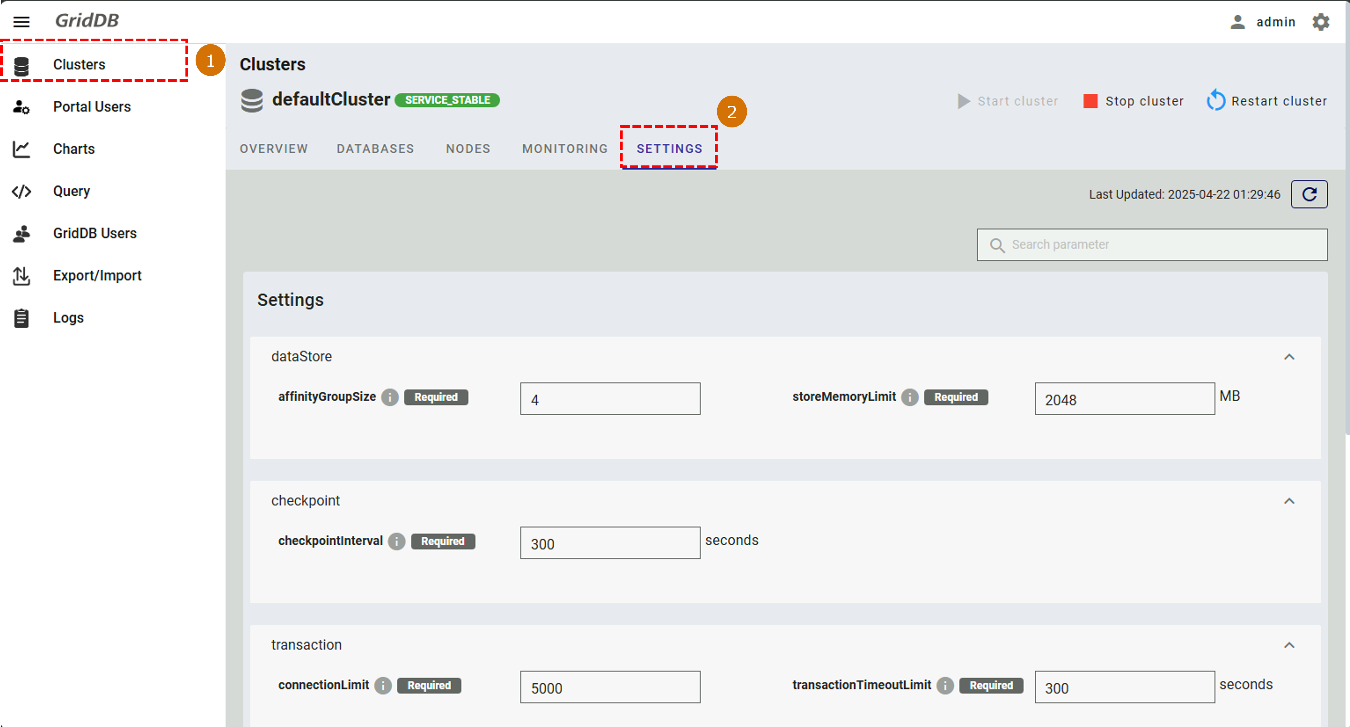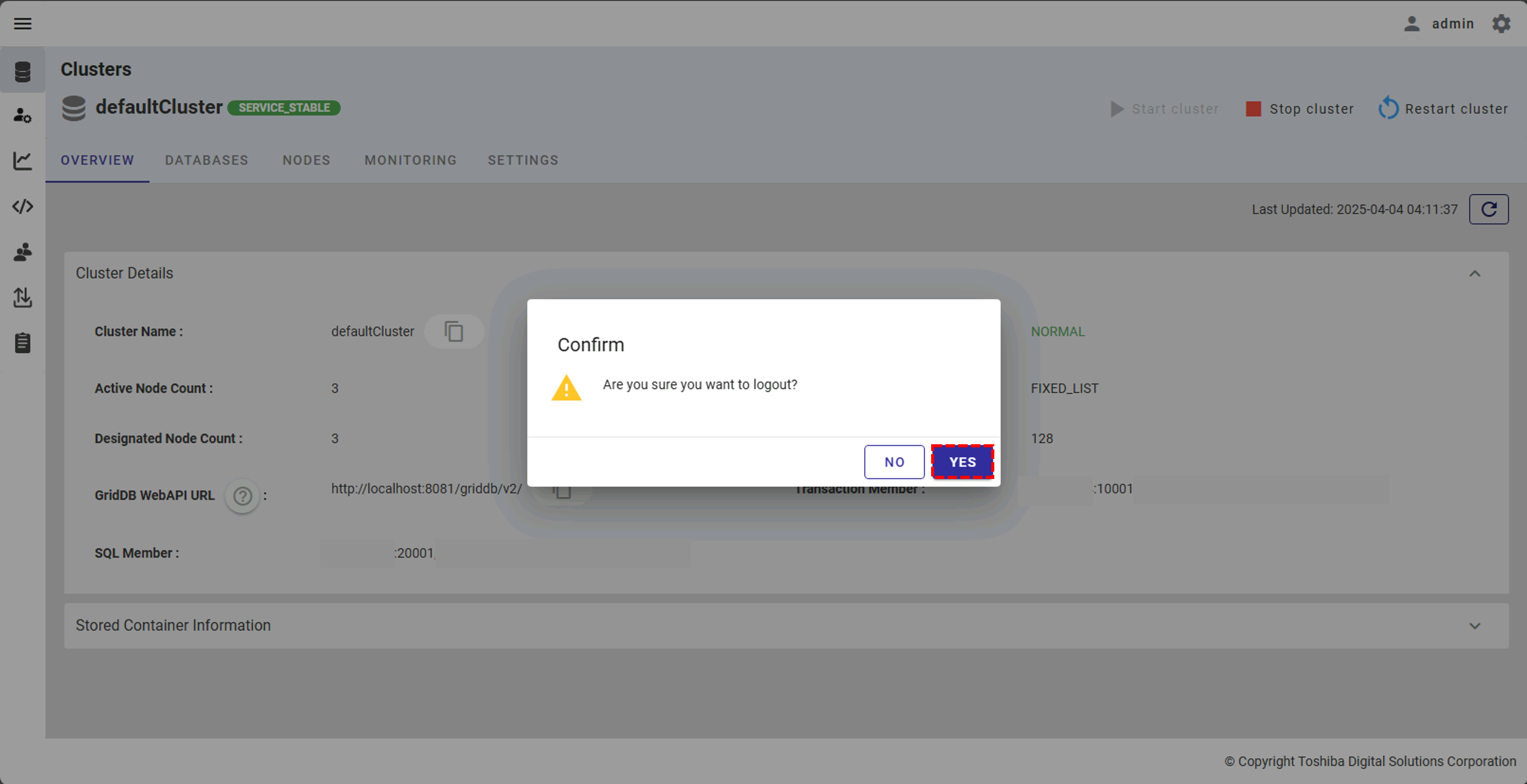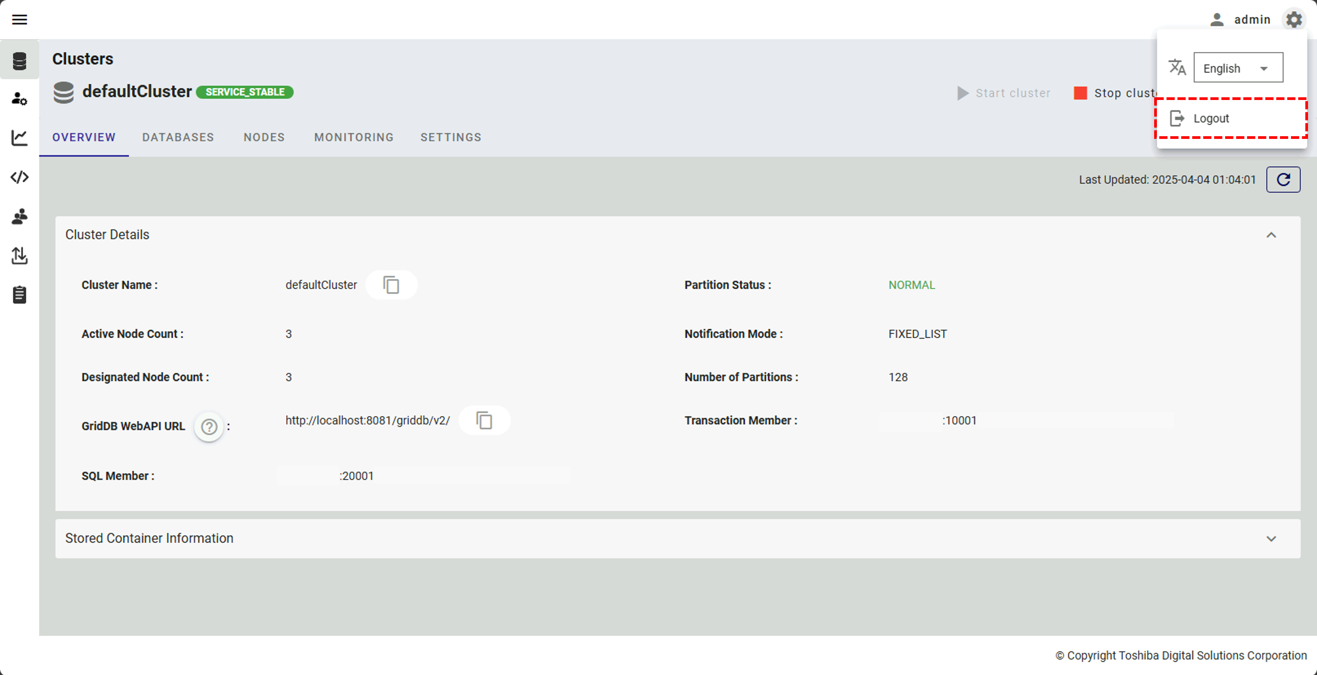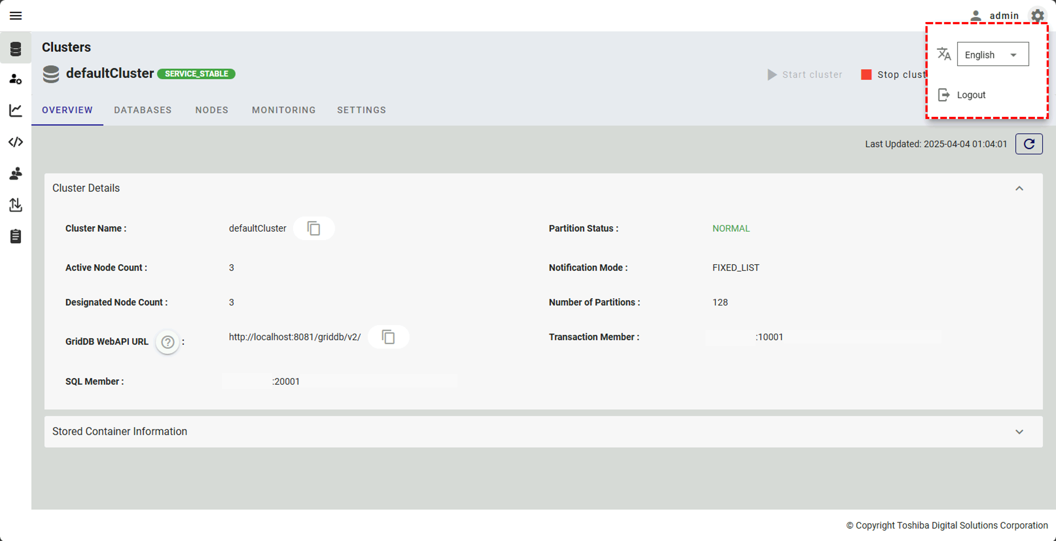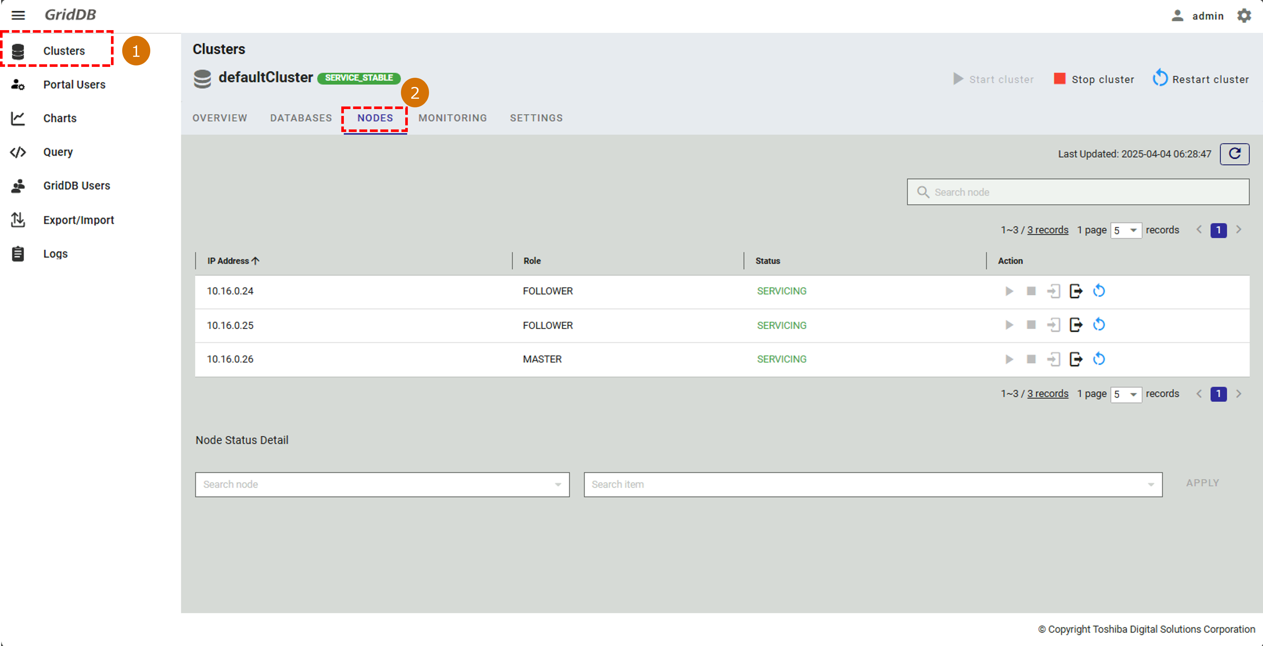 統合運用管理GUI(gs_admin) GridDBクラスタの運用機能を統合した、Webベースの統合運用管理GUI(gs_admin)について説明します。