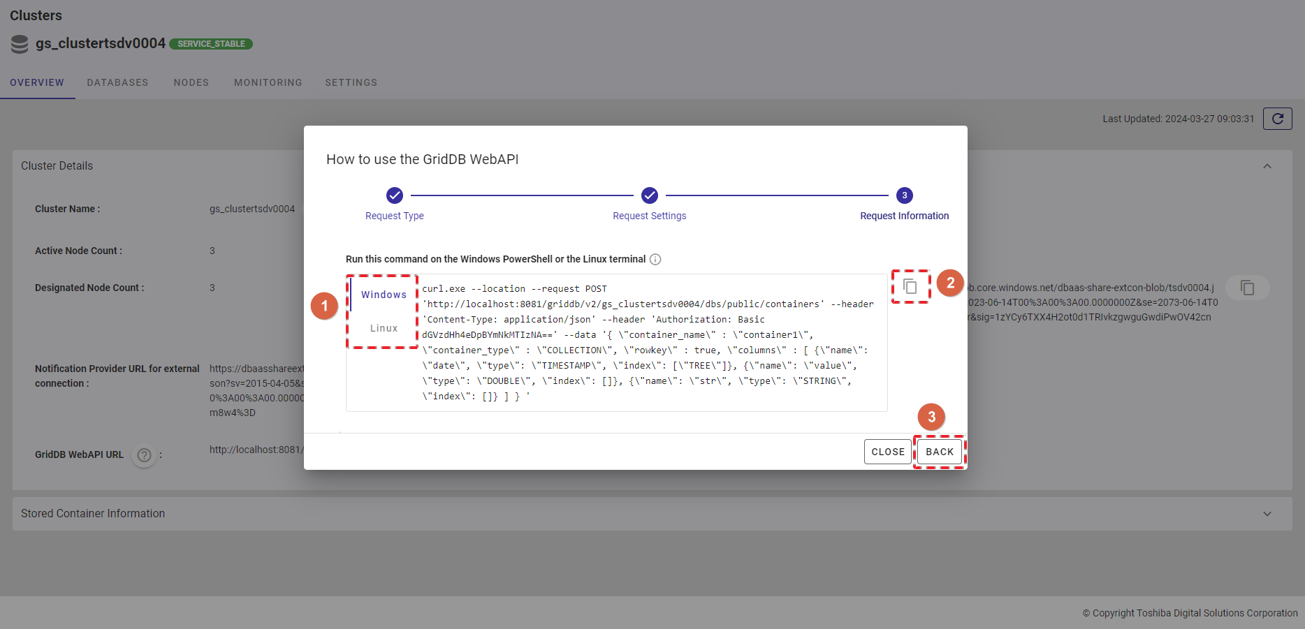 #時系列圧縮を設定したコンテナを検索します。 gs[public]> select database_name, table_name from "#tables" where COMPRESSION_METHOD is not null; 1 件ヒットしました。 gs[public]> get DATABASE_NAME,TABLE_NAME public,c04 1 件の取得が完了しました。■時系列圧縮を設定したコンテナのバックアップ例