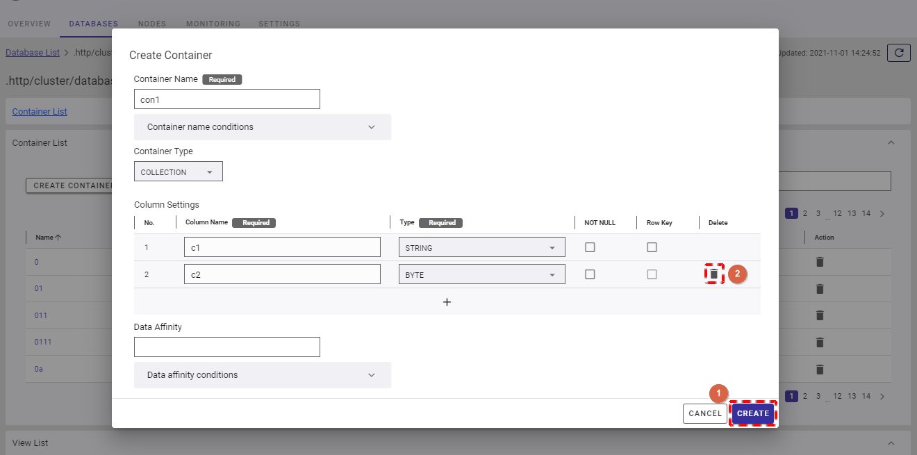 { "version": "4.0.0", "container": "col01", "containerFile": "public.col01.csv", "containerFileType": "csv", "containerType": "COLLECTION", "columnSet": [ { "columnName": "name","type": "string" }, { "columnName": "status", "type": "boolean"}, { "columnName": "count", "type": "long" }, { "columnName": "lob", "type": "byte[]" } ], "indexSet": [ { "columnName": "name", "type": "TREE" }, { "columnName": "count", "type": "TREE" } ], "rowKeyAssigned": true }CSVデータファイル public.col01.csv