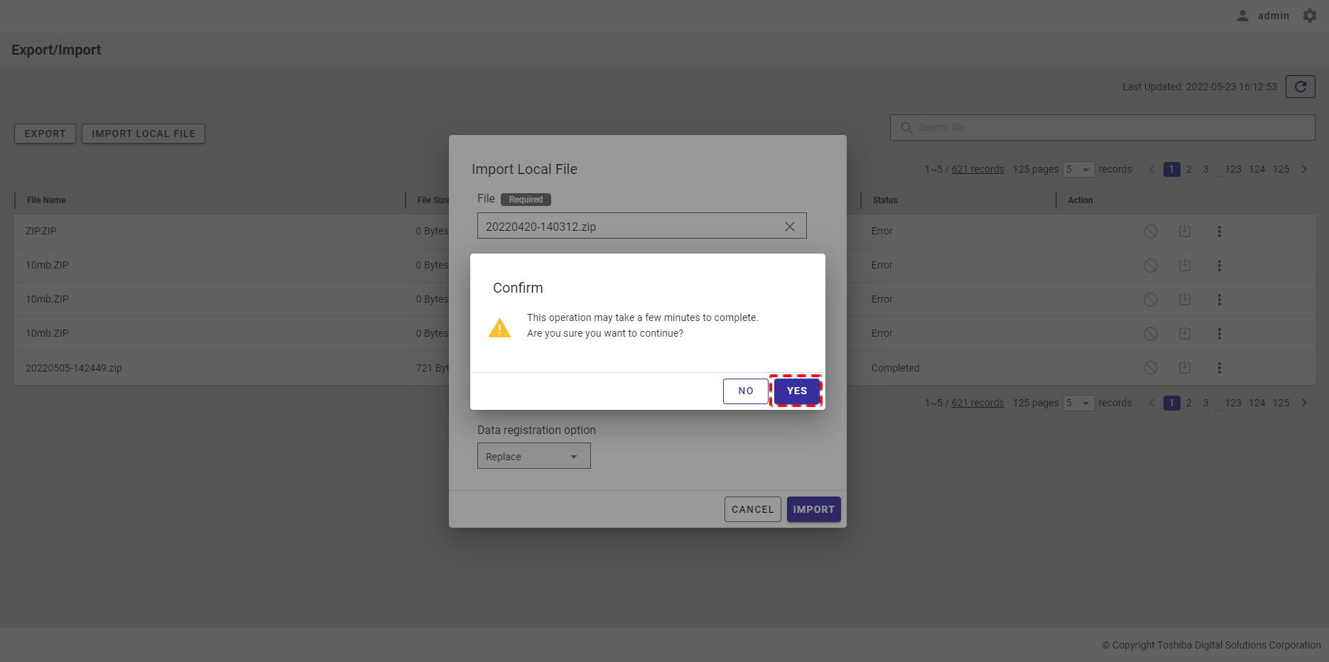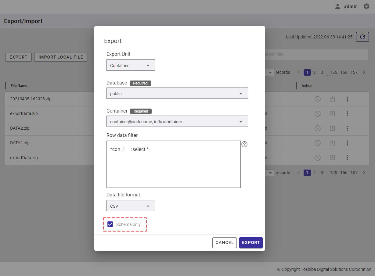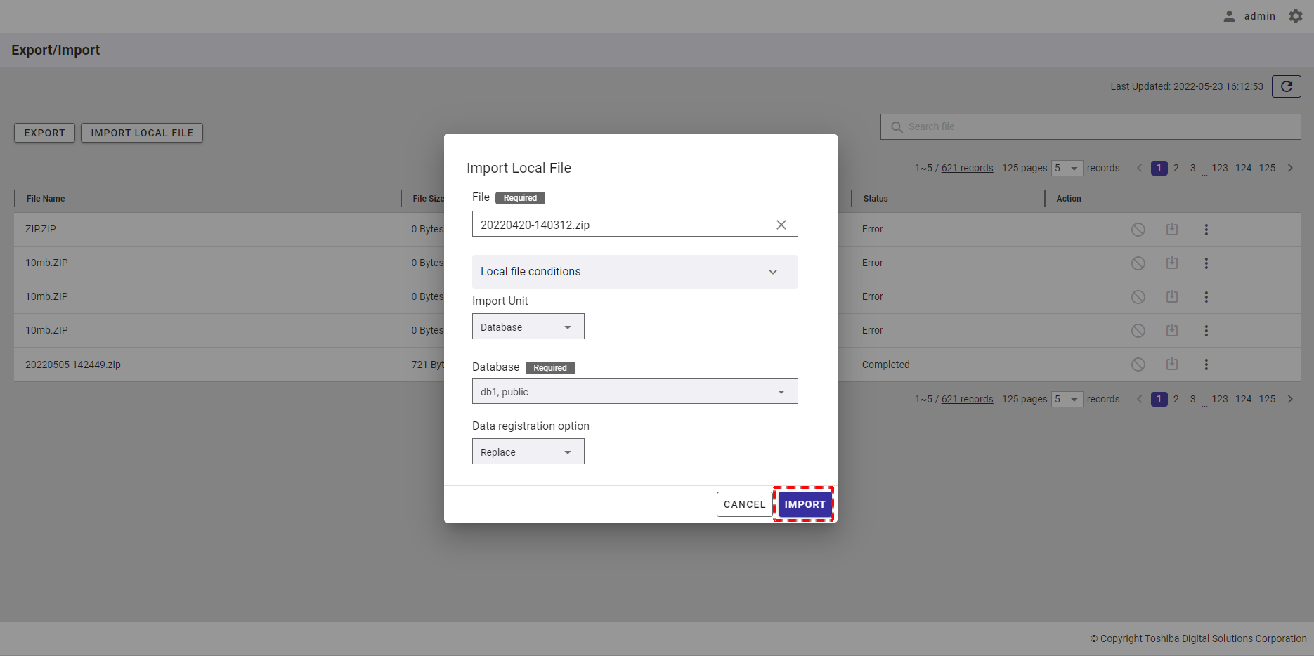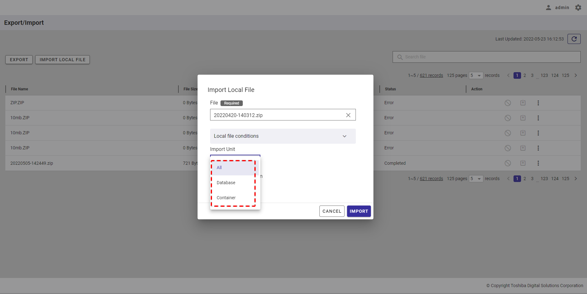 インポートツールを実行する前に、エクスポートツールが出力したメタデータファイルを編集して、コンテナに設定されているロウ期限解放設定、時系列圧縮設定を削除してください。削除しない場合、V5クラスタへのインポートに失敗します。