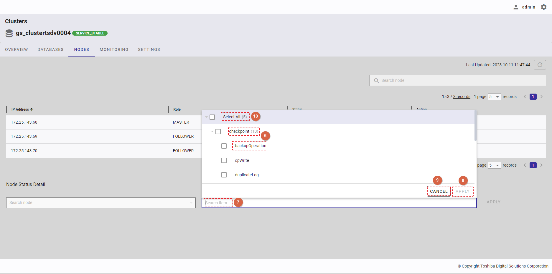 - 各コマンド実行でエラーが発生した場合、運用コマンドのエラーが合わせて表示・記録されます。 エラーへの対応の際は、運用コマンドの項(gs_startnode、gs_joincluster、gs_leavecluster)も合わせて参照してください。