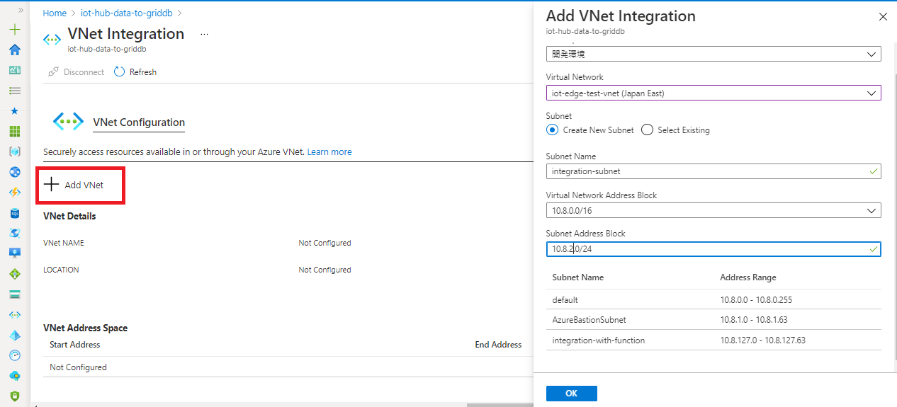 To perform VNet integration, an empty subnet needs to be created in the VNet to be integrated. Click "Add VNet" to create a new subnet.
