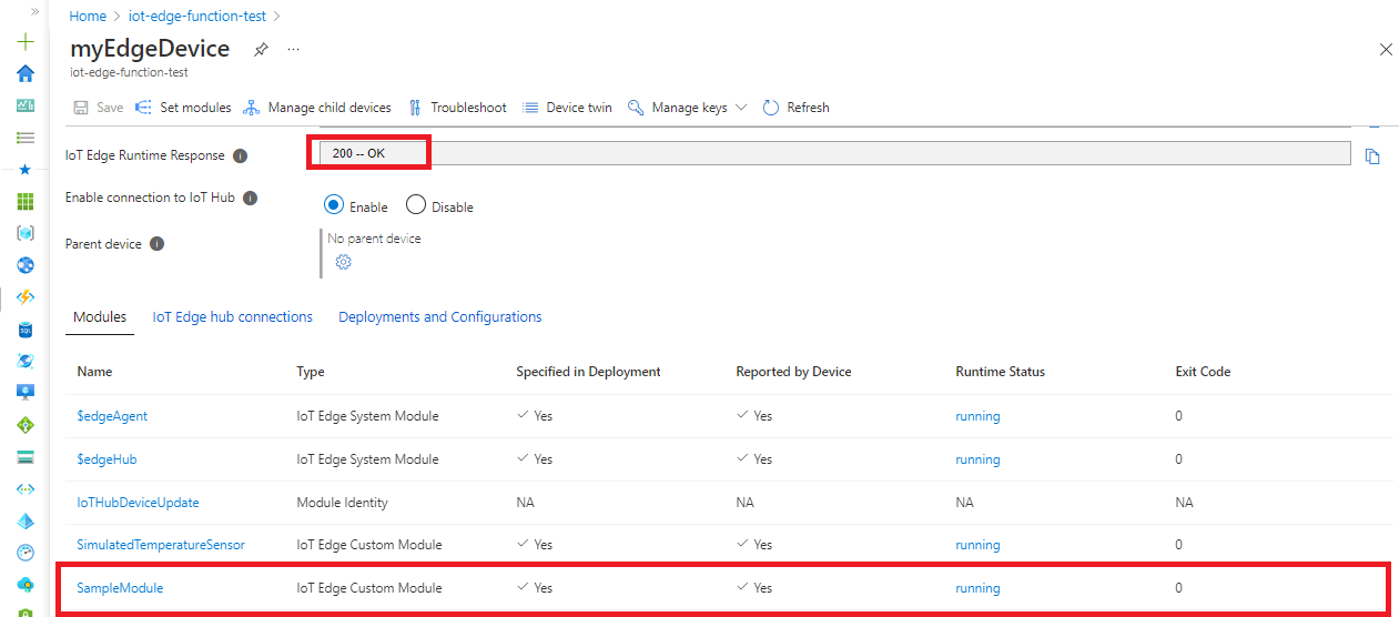| IoT Hub name | Enter the name of the IoT Hub created. | iot-edge-function-test |