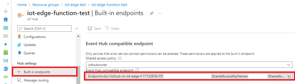 The IoT Hub connection information can be obtained from "Built-in endpoints" of the IoT Hub previously created. Copy the value of "Event Hub compatible endpoint."