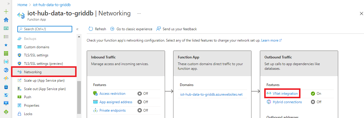 From the Azure portal, open the function app just created. Select "Networking" and then "VNet integration."