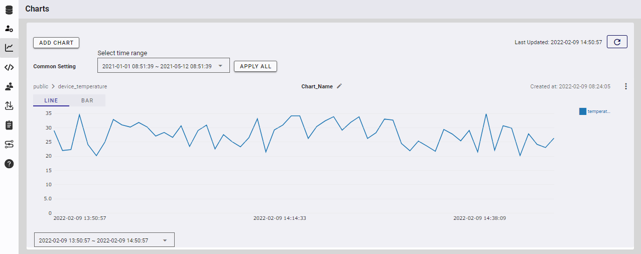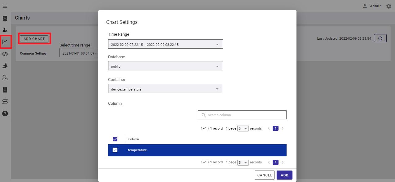 After logging in to the operations management GUI, open the "Charts" page and click "ADD CHART." Once a dialog is displayed, set the following and press "ADD."