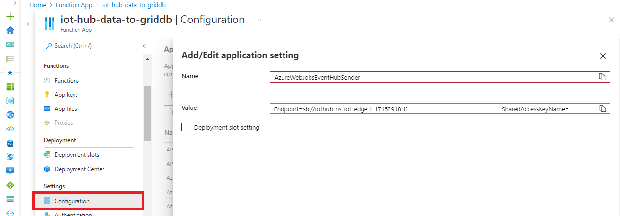 Open the "Configuration" of the function app previously created.Click "Add/Edit application setting" to set the copied value for the name "AzureWebJobsEventHubSender." This setting is automatically assigned to the following parameter.