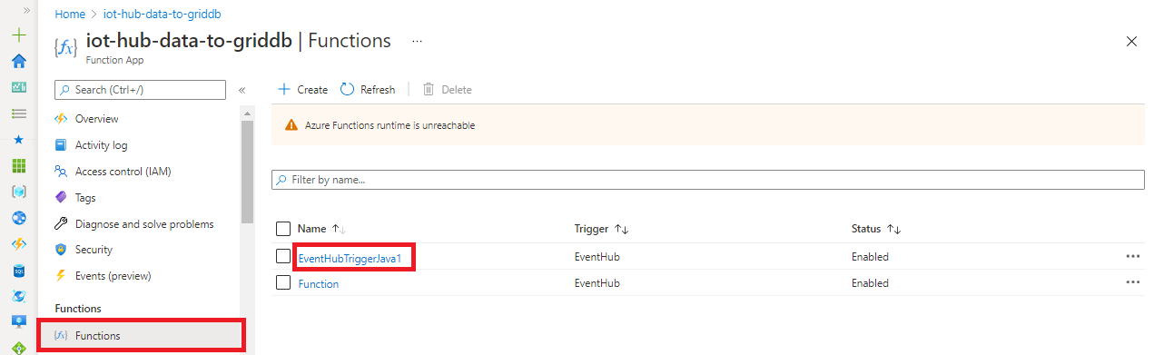 | Azure Functions | a serverless architecture that allows users to provide functions simply by writing code and settings. Functions are set by each function app. In this document, a function app is created to receive Azure IoT Hub data and register it in GridDB. For details, see Microsoft documentation. |