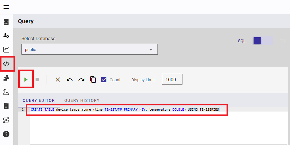Log in to the operations management GUI and open the Query editor. Execute the following SQL statement to create a timeseries container consisting of a timestamp and a temperature in the public database.