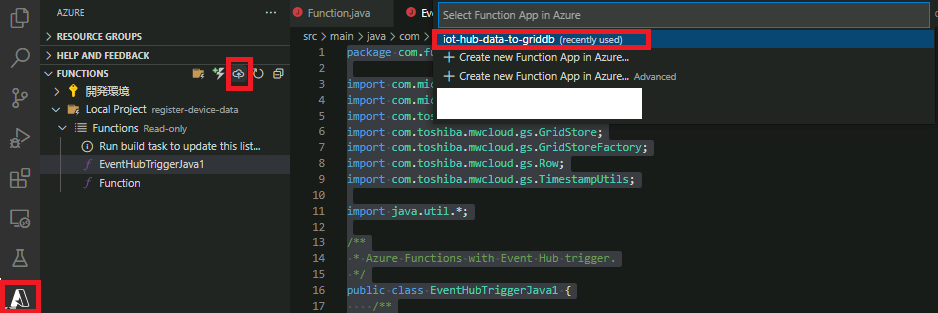 Open the Azure extension for VS Code and deploy "EventHubTriggerJava1." Once the deployment destination is displayed, specify the function app previously created.