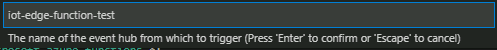 Continue to select the default value until a command palette for entering the name of the Event hub (Notice it is not "IoT Hub", but this is not a problem) is displayed. For the name of the Event hub, enter the name of the IoT Hub previously created.