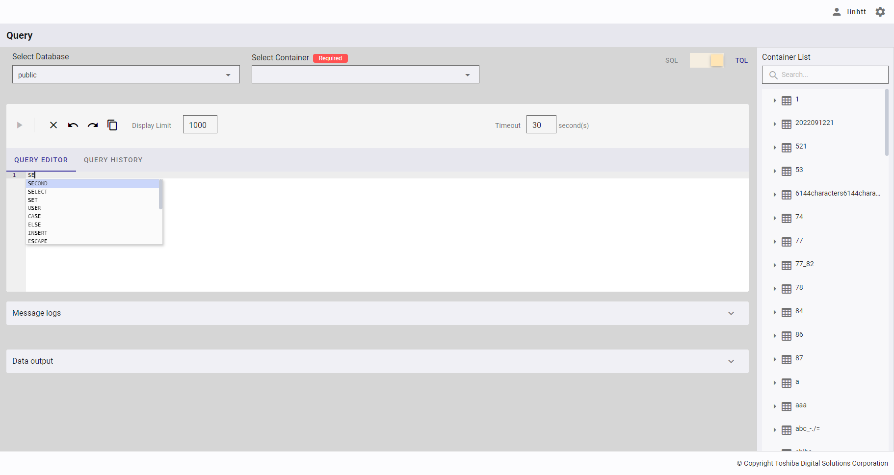 Step 1: After selecting the database and container (TQL mode only), enter your query in the [QUERY EDITOR].