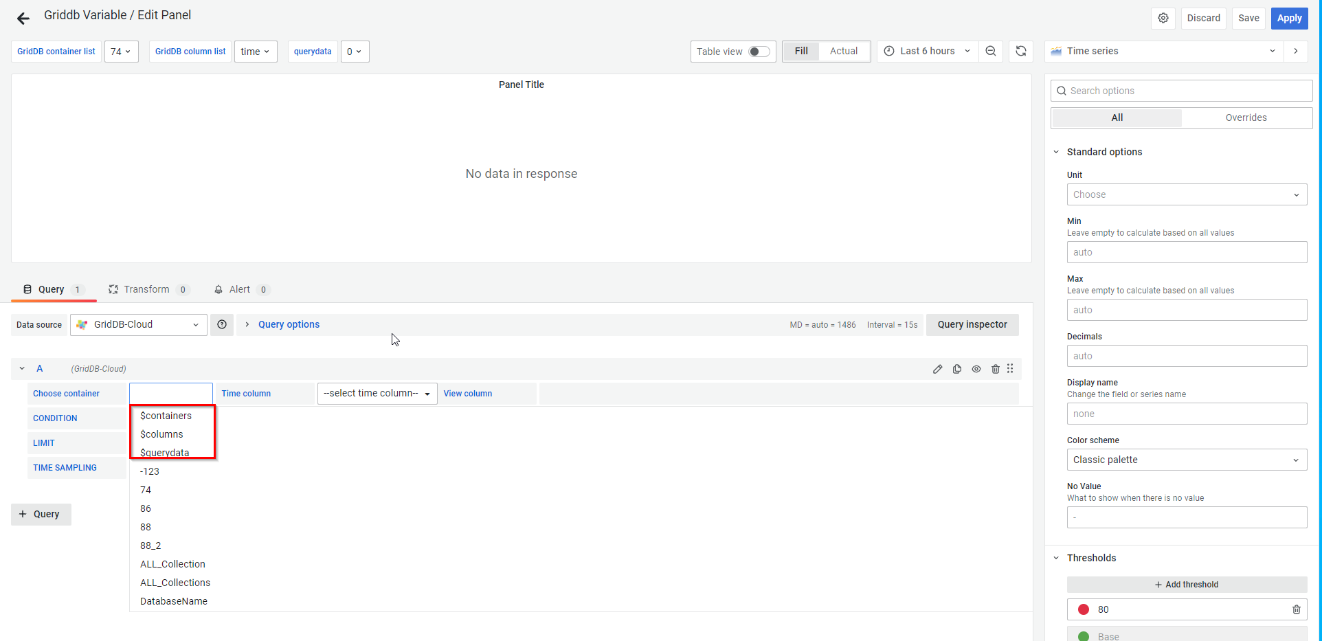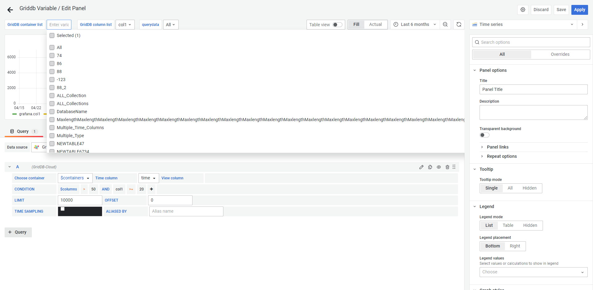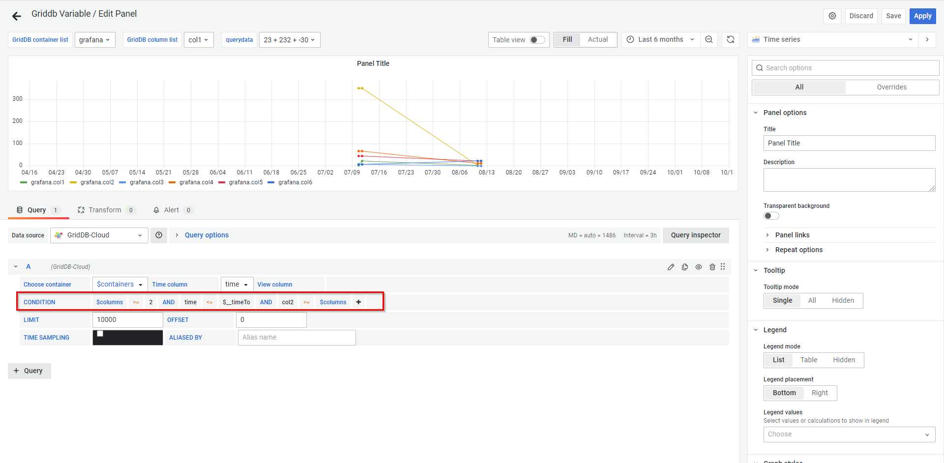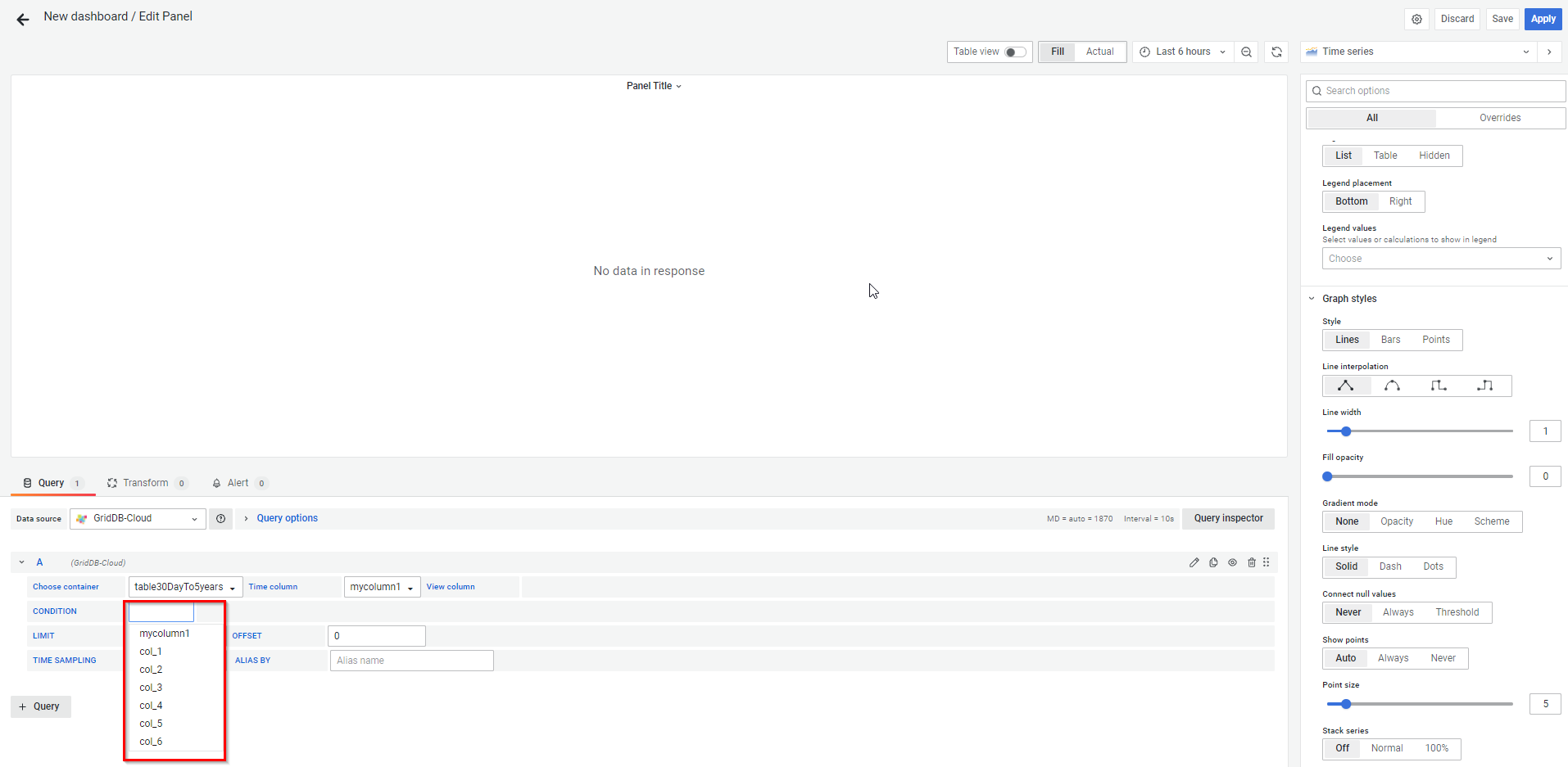 Variable for a column list of the container 'grafana' $griddb_query_data({container name}, {columns}, {TQL})