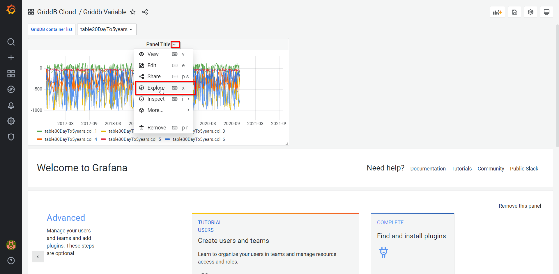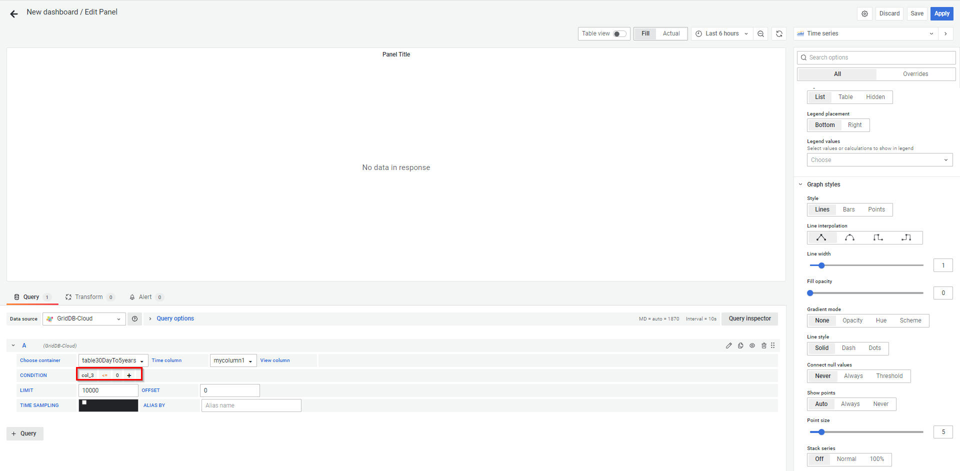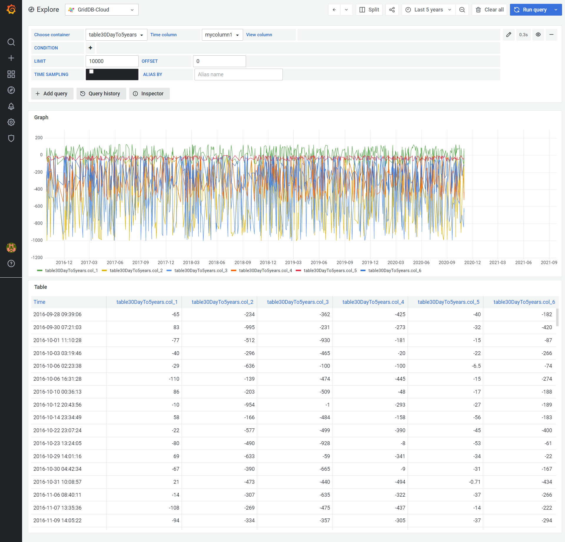 Variable for a column list of the container 'grafana' $griddb_query_data({container name}, {columns}, {TQL})