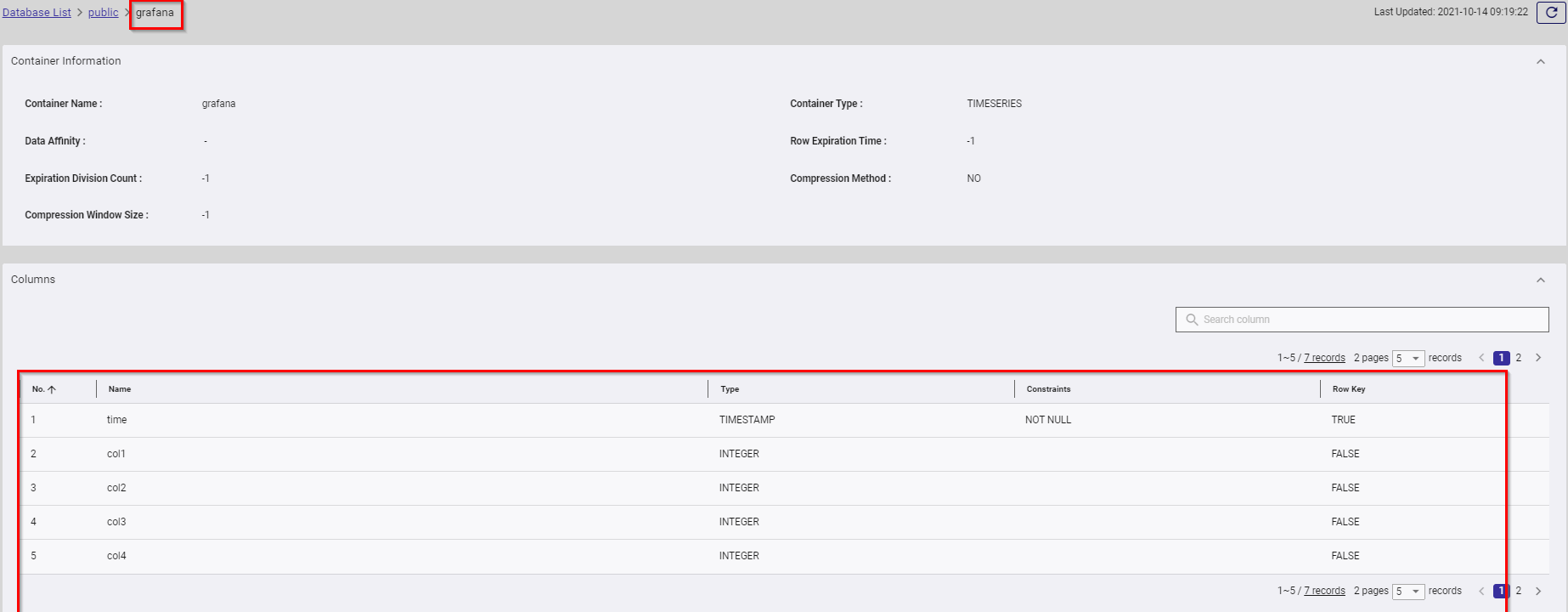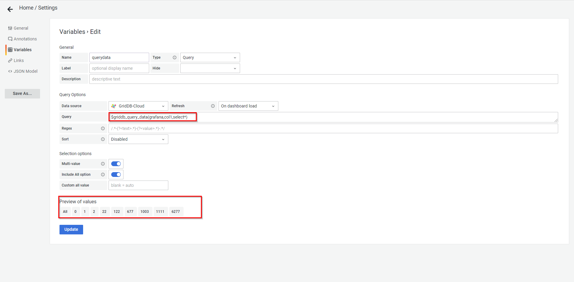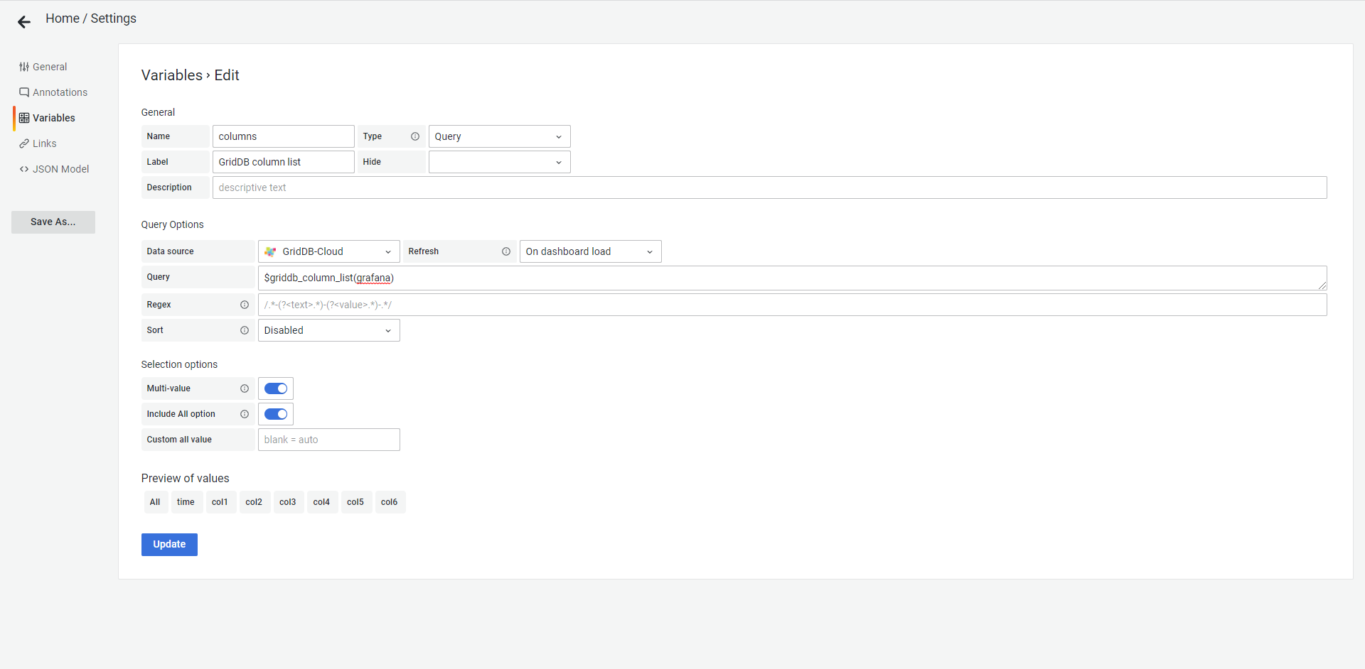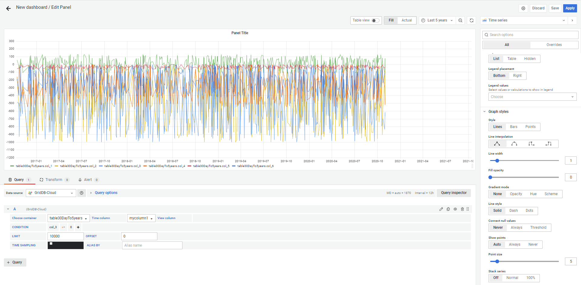 Variable for a column list of the container 'grafana' $griddb_query_data({container name}, {columns}, {TQL})