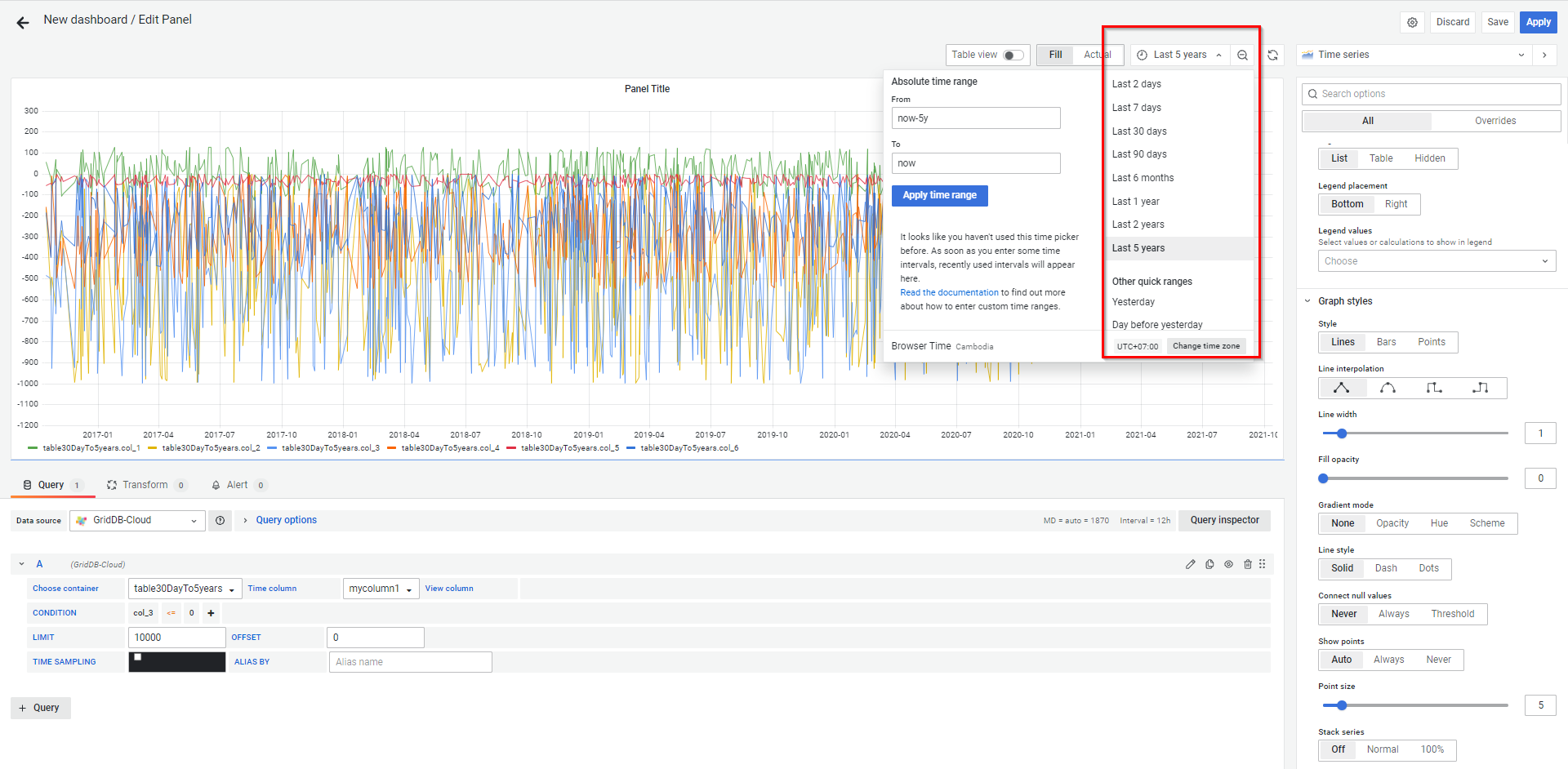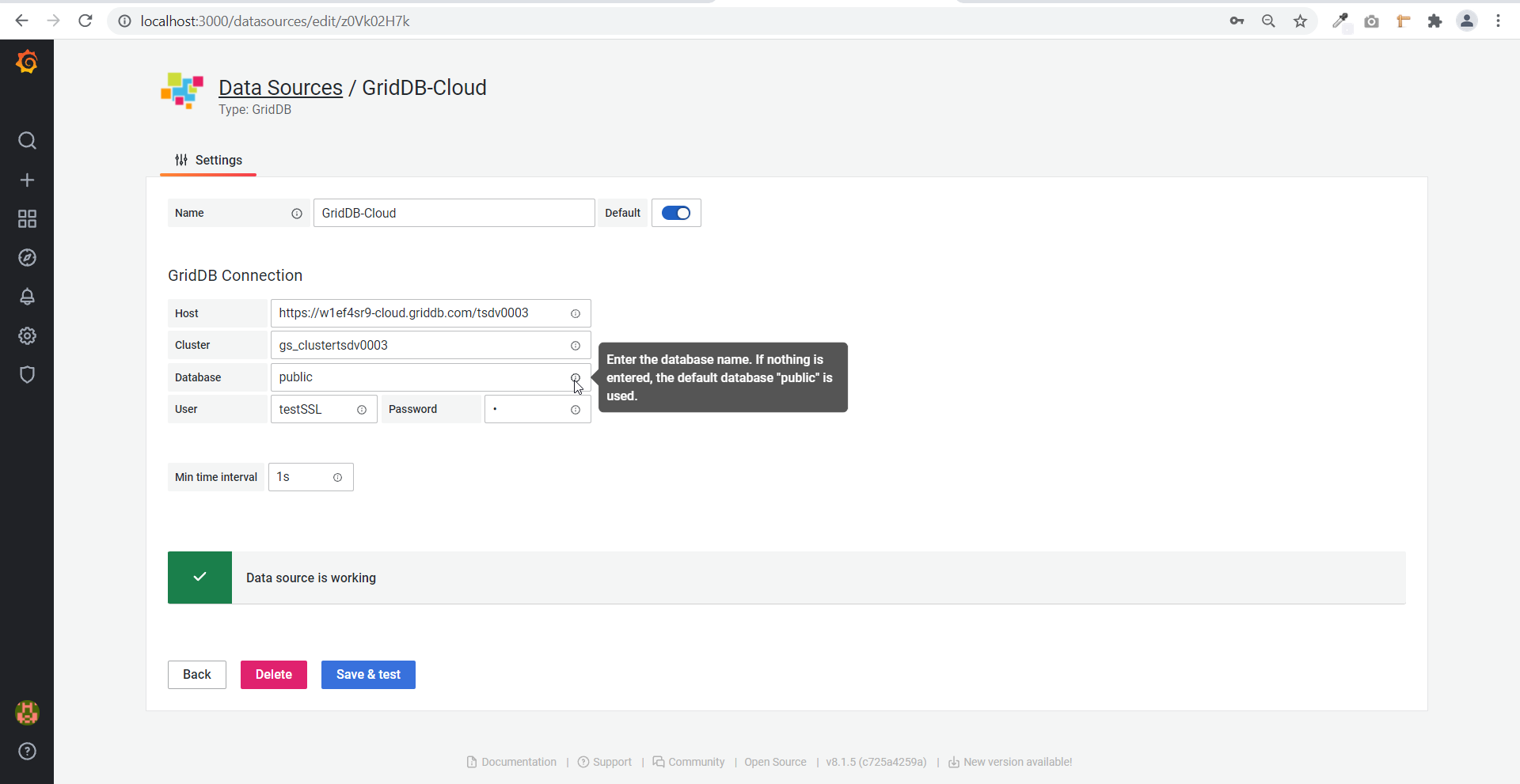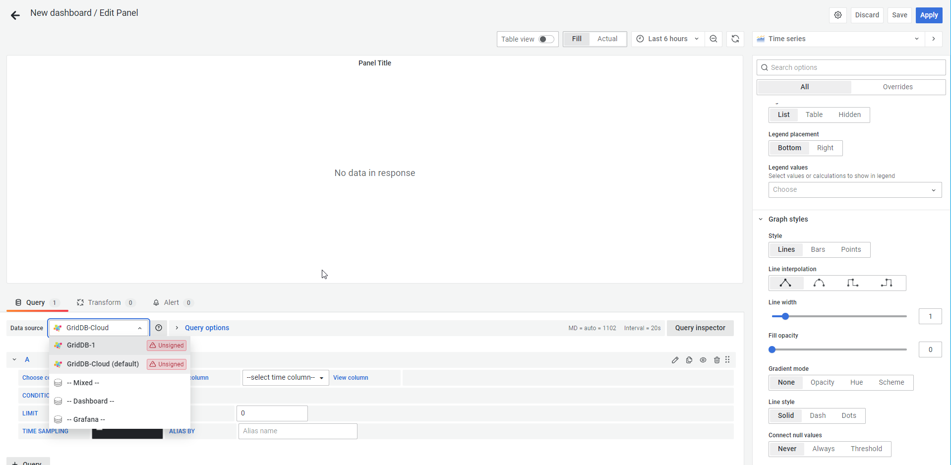GridDBin the search field. EnsureGridDBis shown for the data source and click the Select button.Enter any data source name (e.g., GridDB-Cloud) in the Name field.