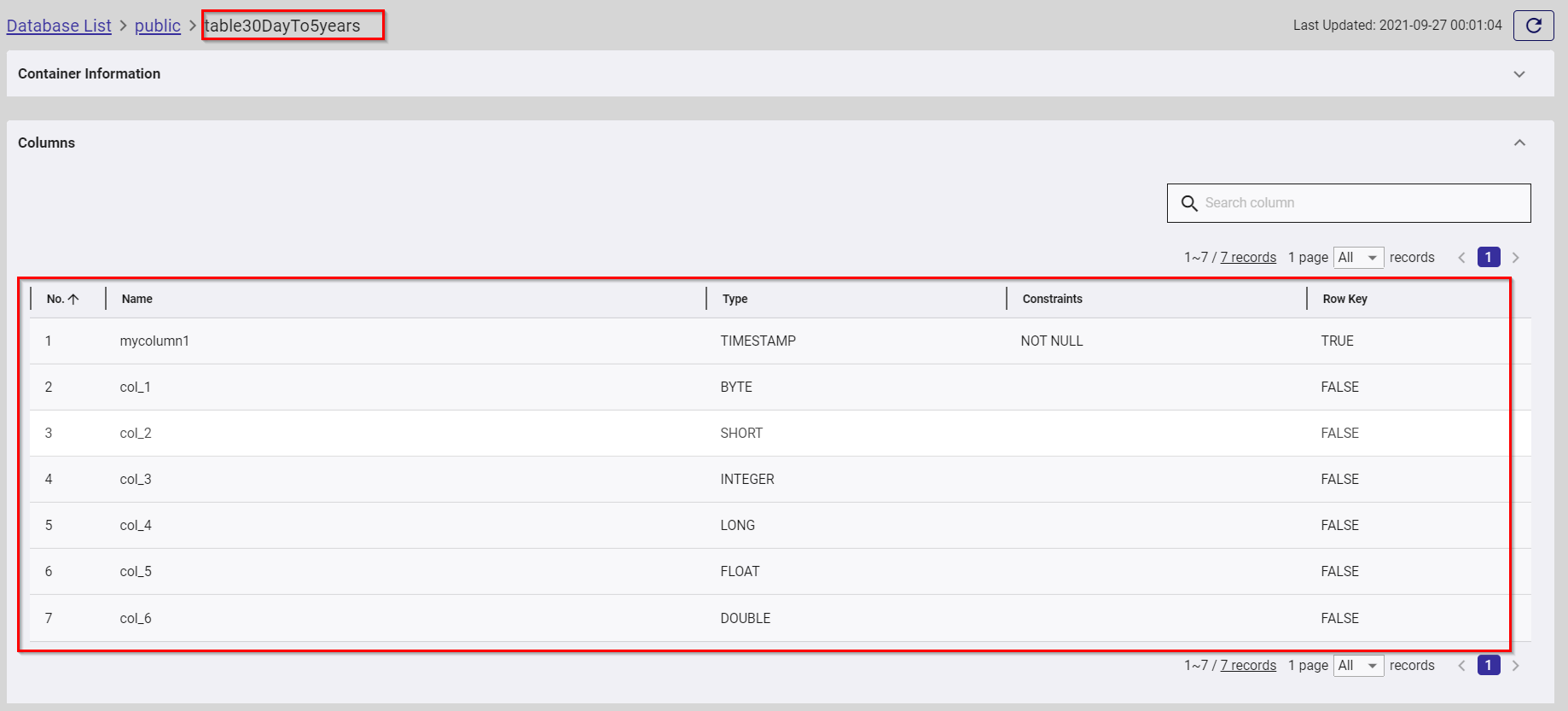 | Name | Type | Constraints | |--------- |----------- |------------- | | mycolumn1 | TIMESTAMP | NOT NULL | | col_1 | BYTE | | | col_2 | SHORT | | | col_3 | INTEGER | | | col_4 | LONG | | | col_5 | FLOAT | | | col_6 | DOUBLE | |