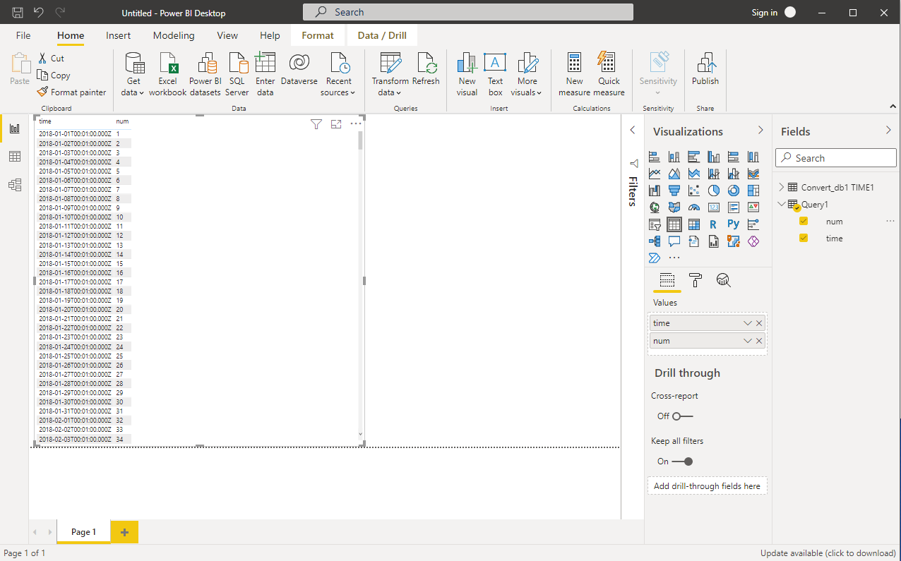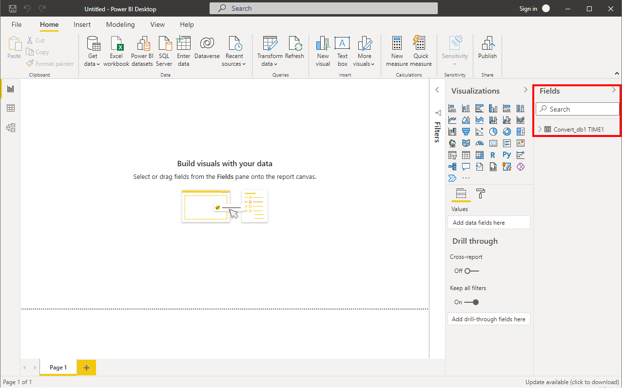 Check that the data retrieved via ODBC is imported into Power BI Desktop and applied to the Fields pane.