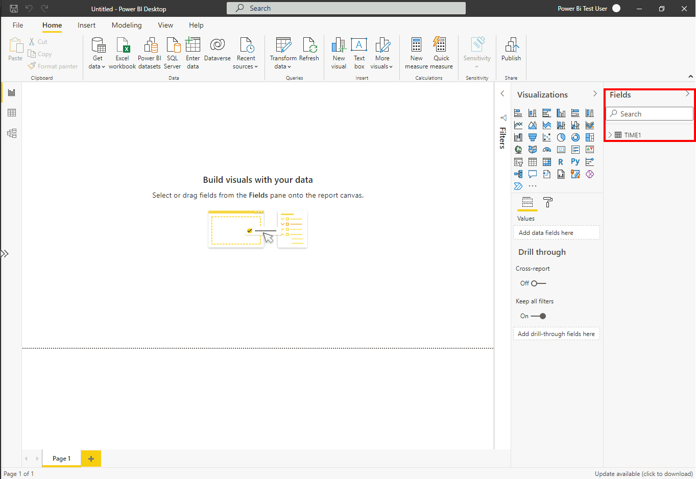 The data retrieved via a file is thus imported into Power BI Desktop and applied to the Fields pane, after which the data becomes available to be analyzed in Power BI Desktop.