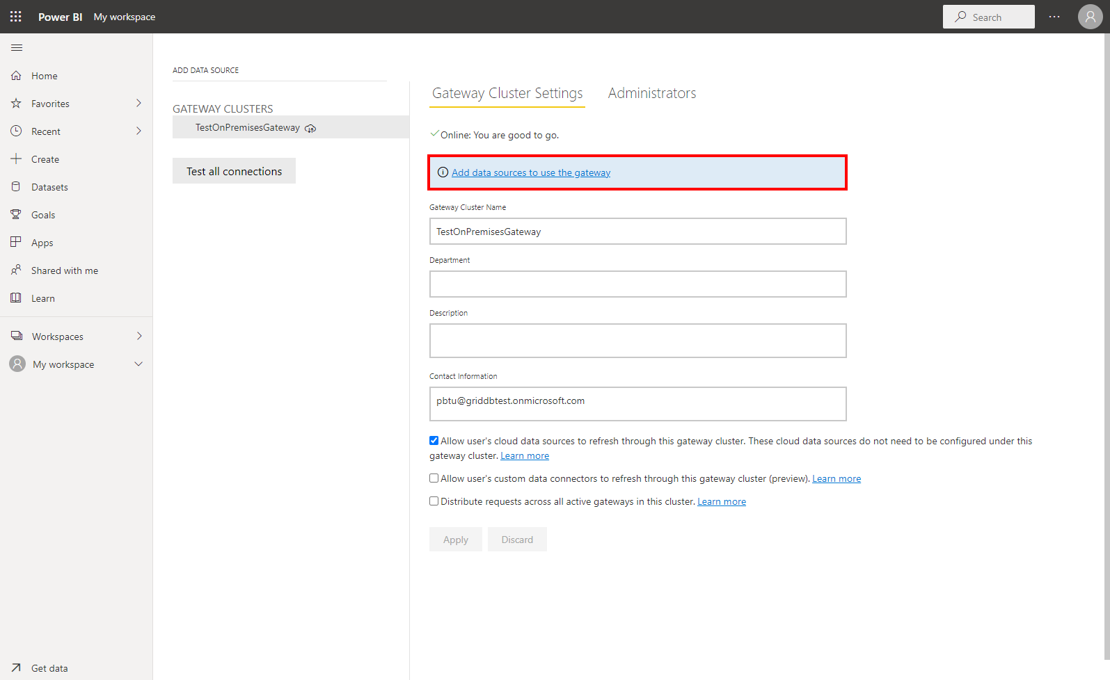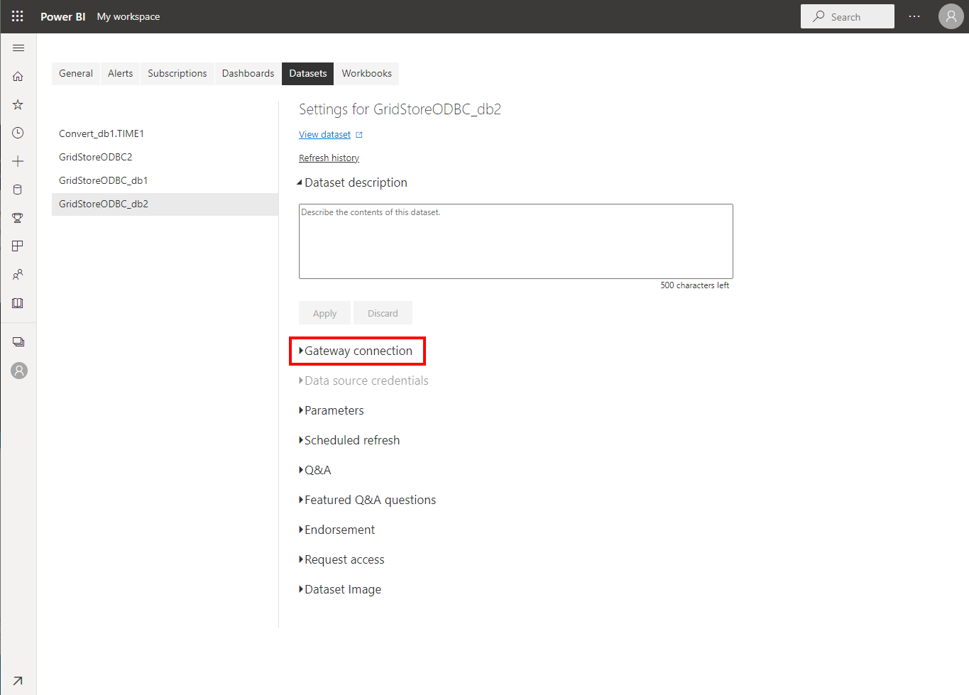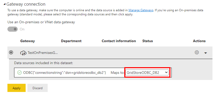 Select [Gateway connection] to open a window for setting connection to the on-premises data gateway.