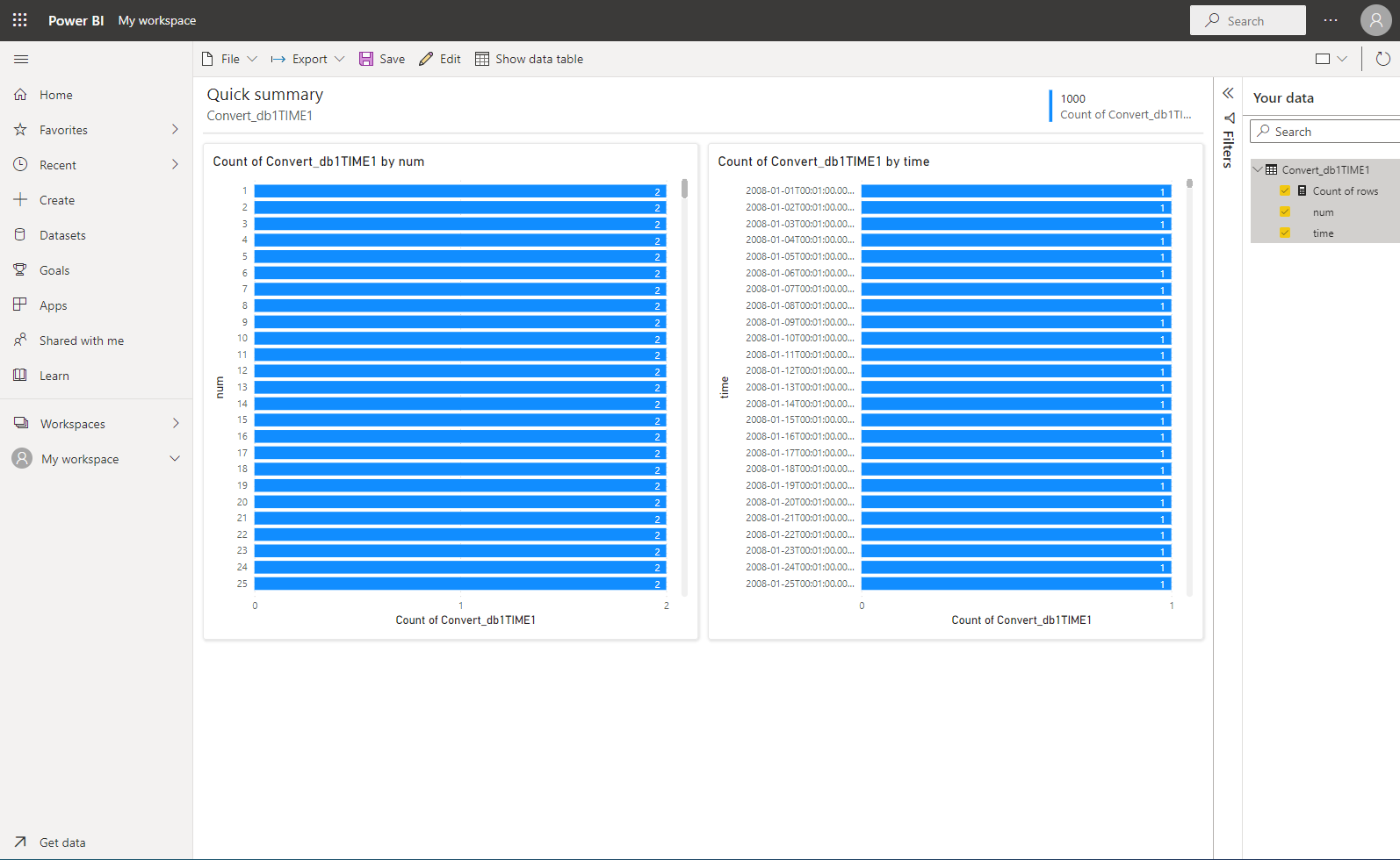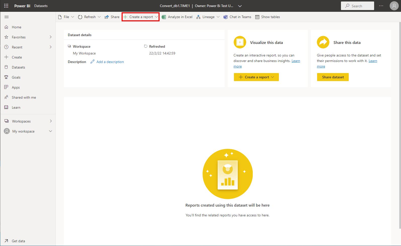 The data retrieved via a file is thus imported into the Power BI Service. Select [Datasets] from the menu on the bottom left of the window and check that the data (dataset) is displayed in the window.