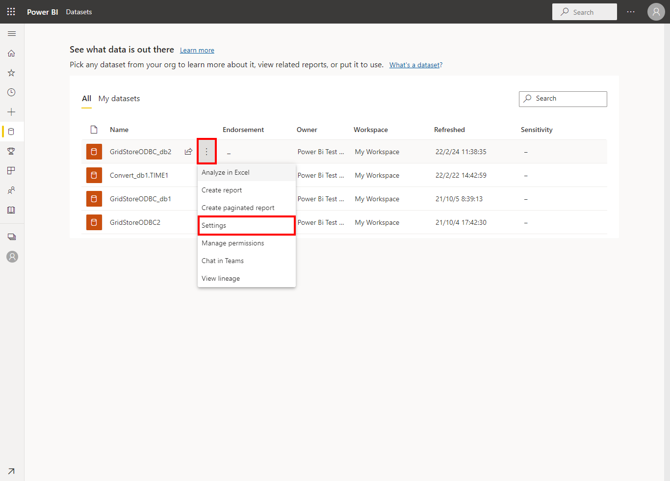 Select the three vertical dots (...) next to a dataset, and then select [Settings].