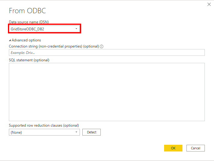 In the [From ODBC] screen that appears, select the DSN for the GridDB ODBC driver previously set up on a Windows VM. Once it is selected, press [OK].