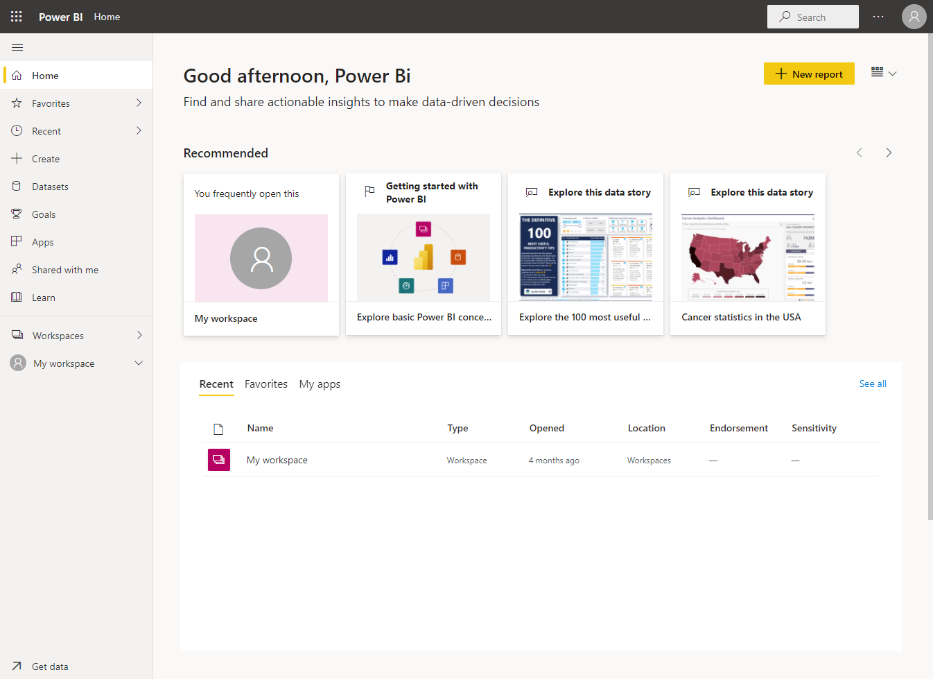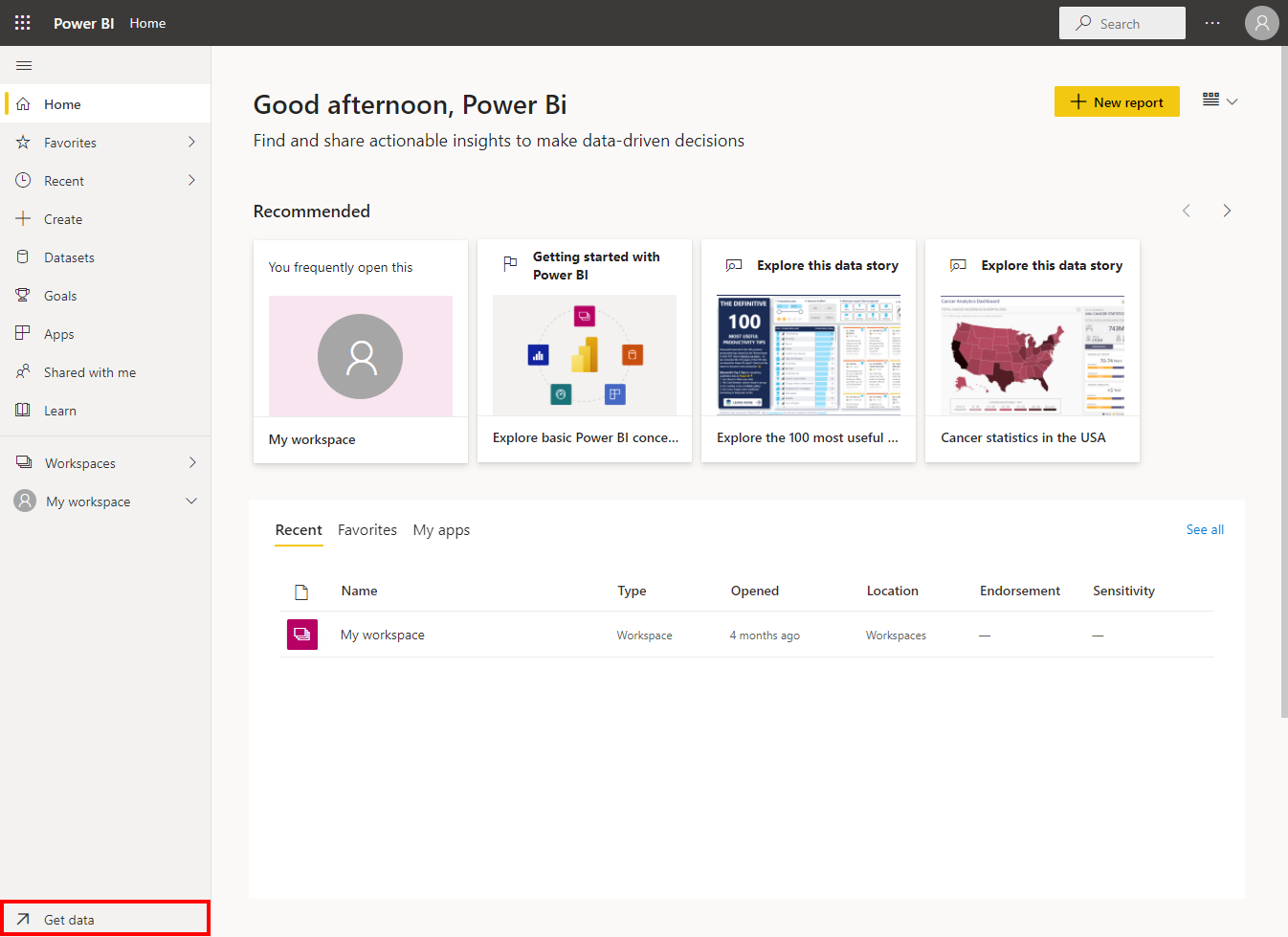 Get a Power BI account on the official home page for Microsoft Power BI.