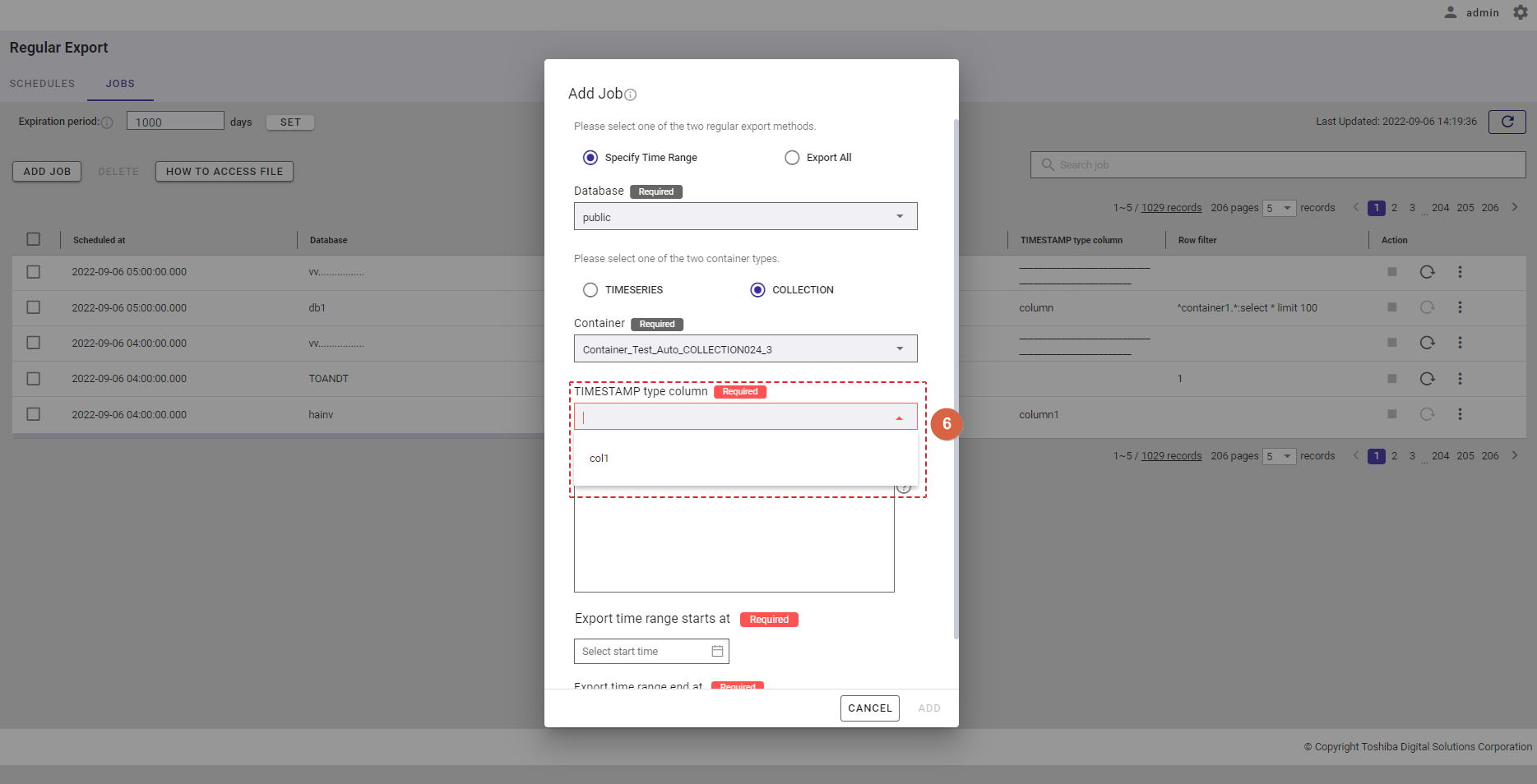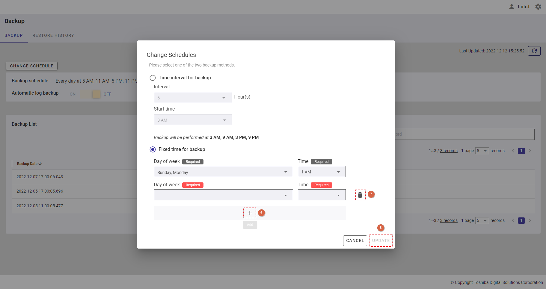 ステップ5: [UPDATE] ボタン (⑥) をクリックしてバックアップ・スケジュールを変更するか、 [CANCEL] ボタンをクリックして、スケジュールの変更をキャンセルします。