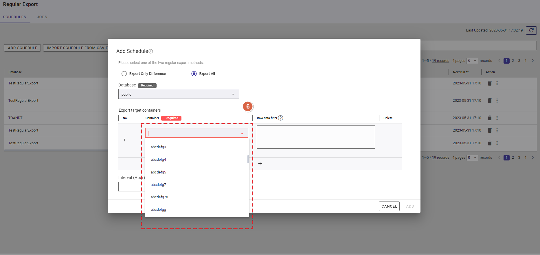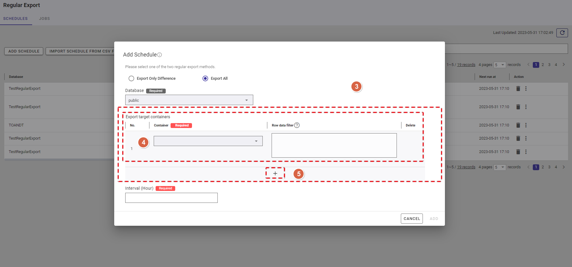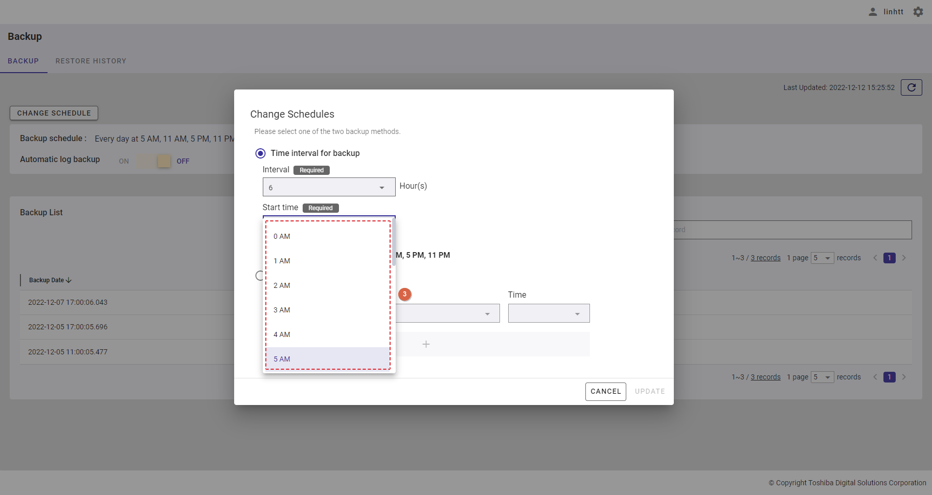 ステップ4: [UPDATE] ボタン (⑤) をクリックし、バックアップ・スケジュールを変更するか、 [CANCEL] ボタンをクリックし、 [Change Schedule] ダイアログを閉じます。