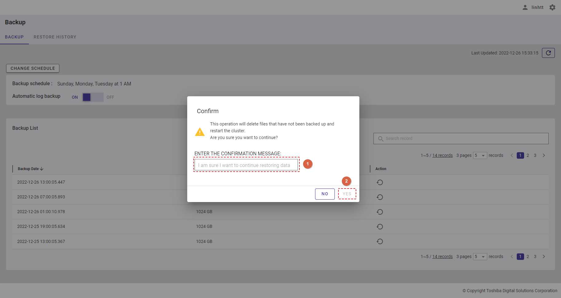 ステップ2: 確認ダイアログが表示されるので、確認メッセージ (①) 「I am sure I want to continue restoring data.」を入力し、データをリストアします。これ以外のメッセージでは [YES] ボタン (②) はアクティブになりません。