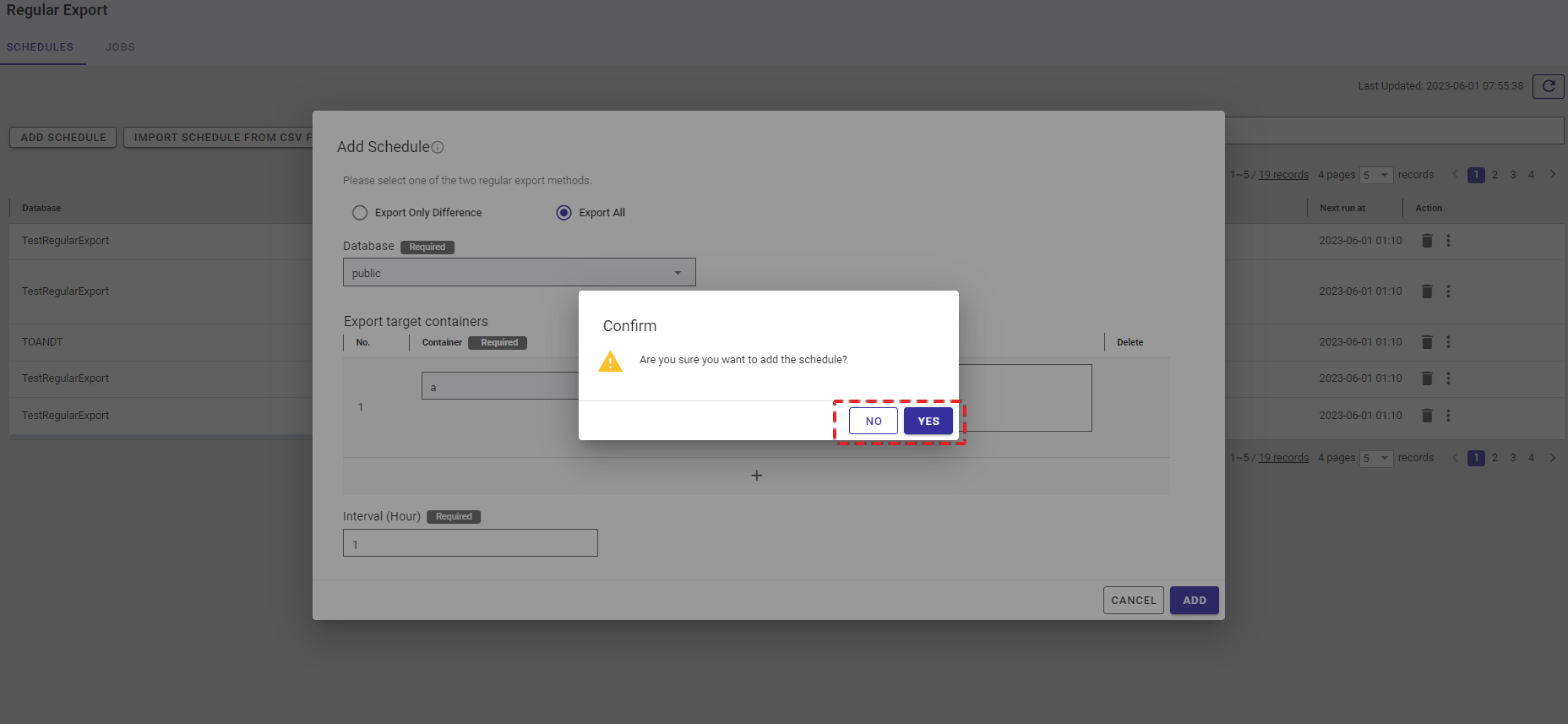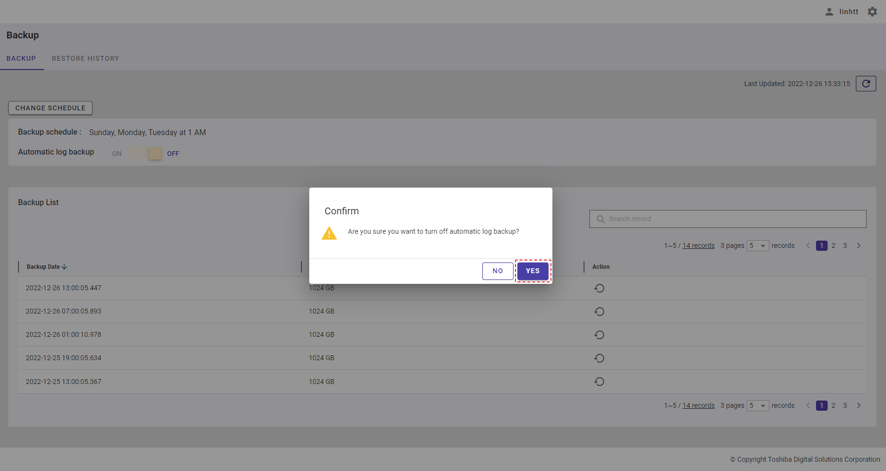 ステップ2: 確認ダイアログが表示されるので、 [YES] ボタンをクリックして、自動ログバックアップのステータスを変更します。変更しない場合は、 [NO] ボタンをクリックし、Backup画面に戻ります。