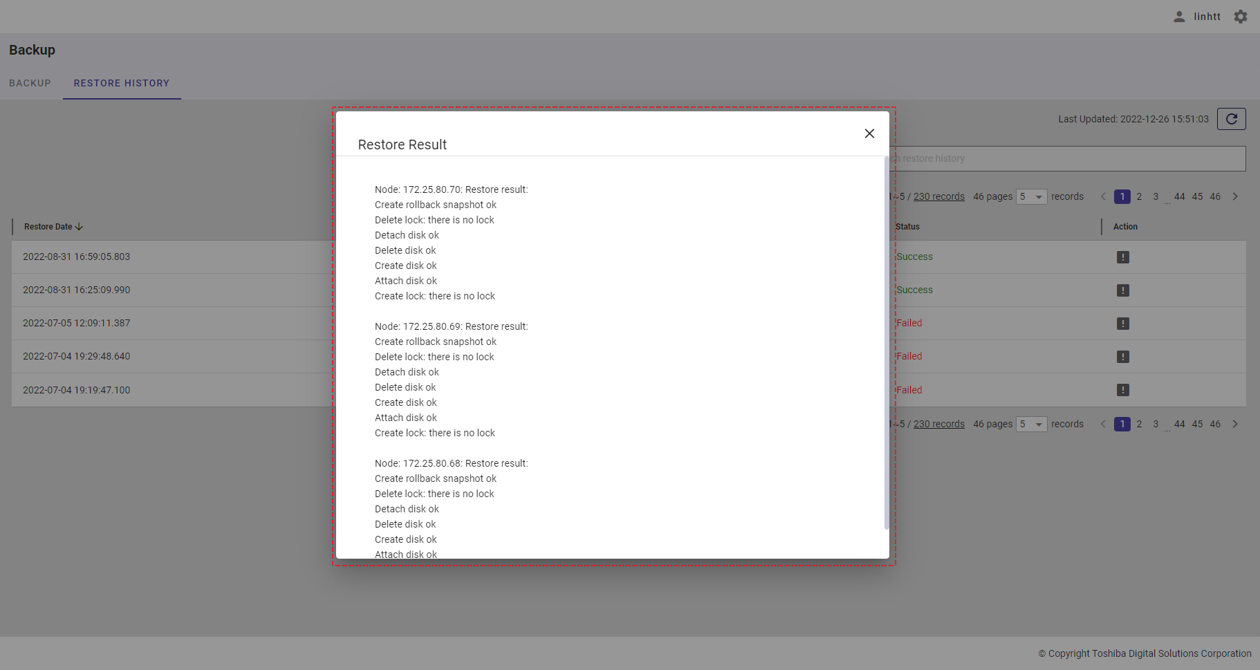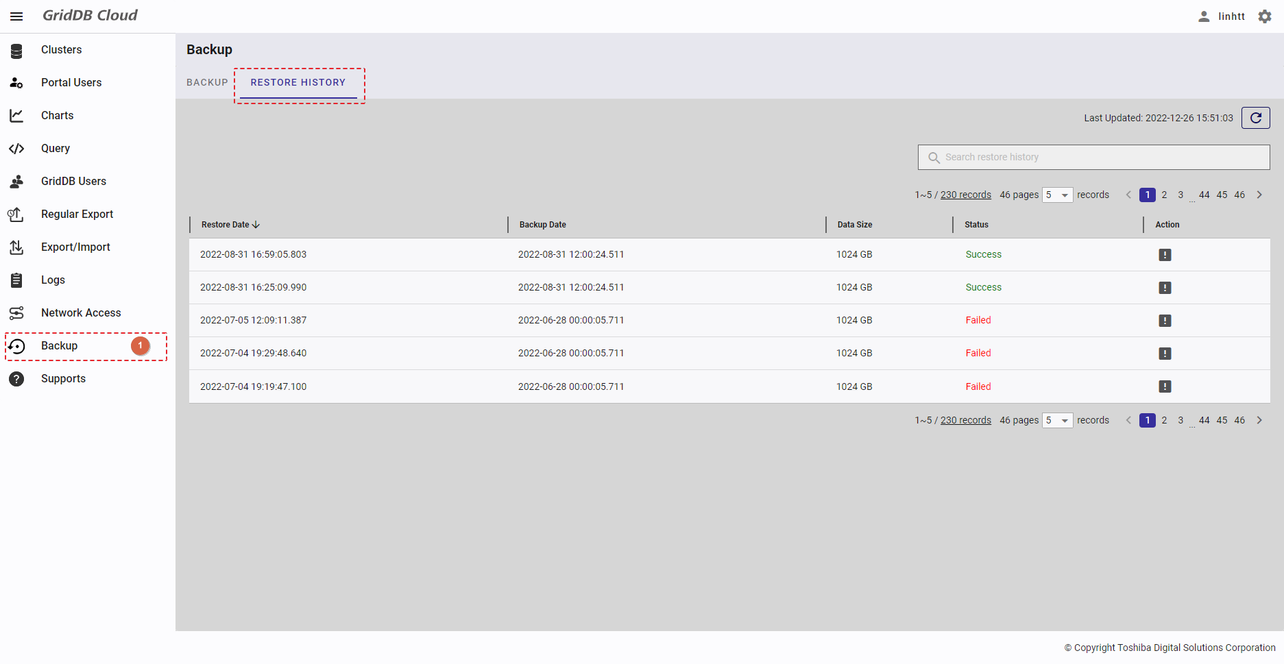 RESTORE HISTORY(リストア履歴)タブのリストアステータスが更新されていることがわかります。ステータスにはSuccess、Failed、Recoveringの3つがあります。