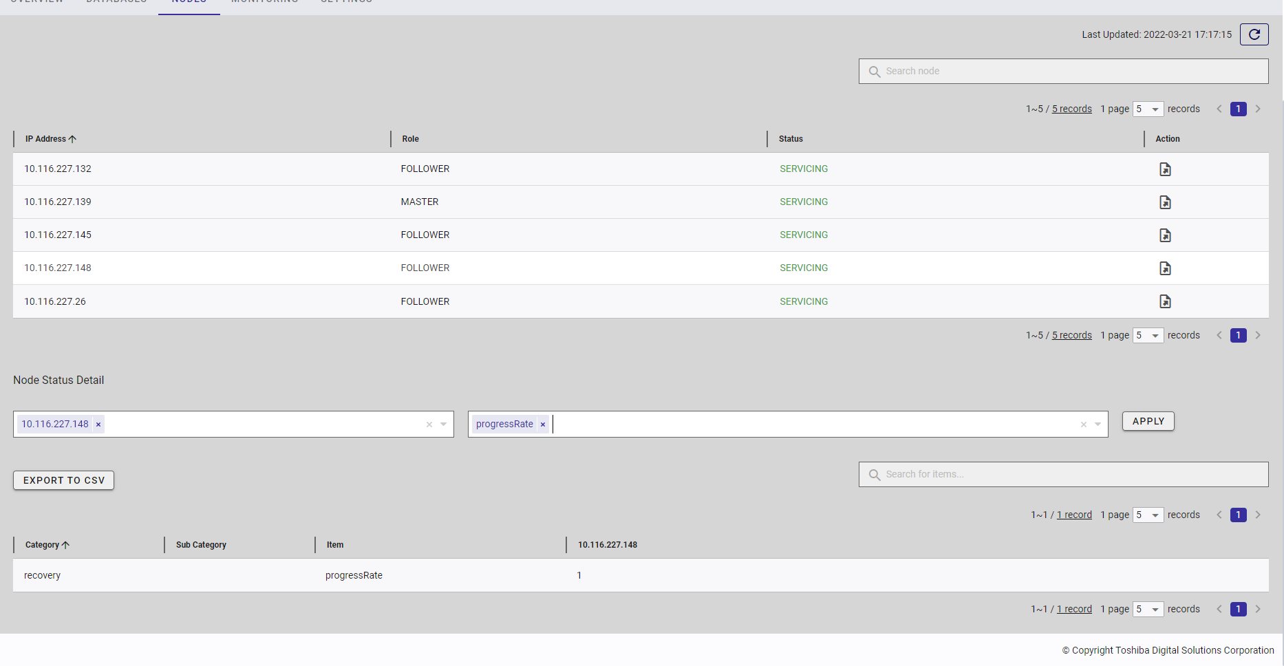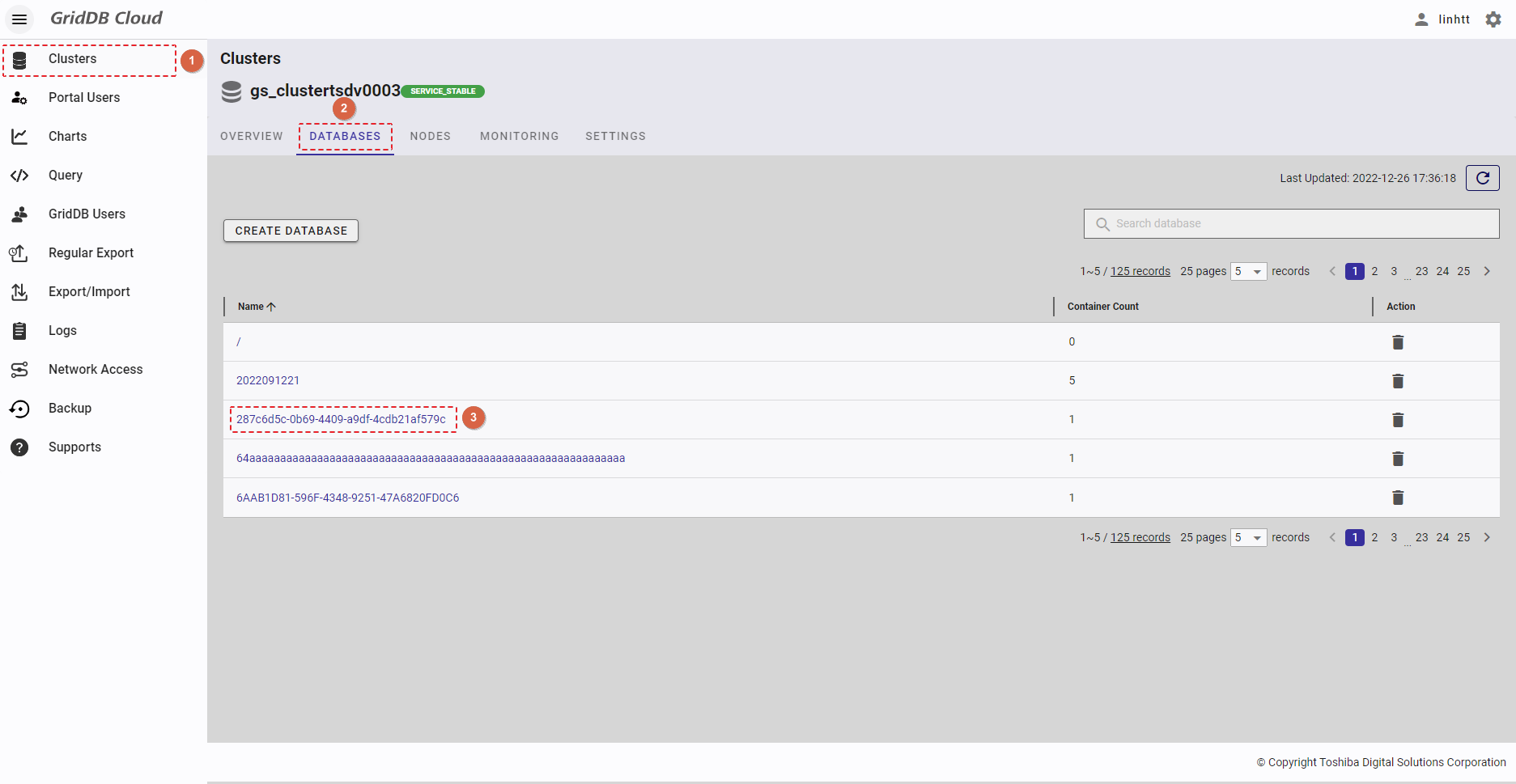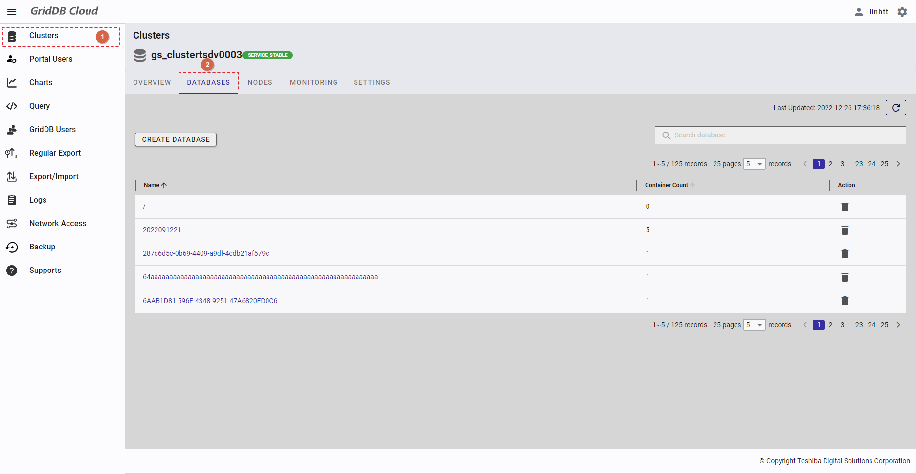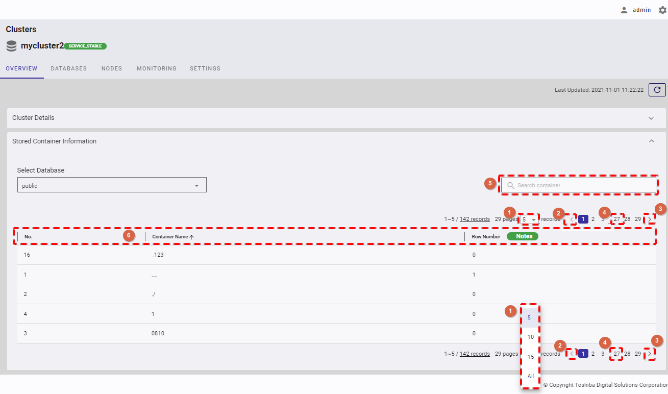 ステップ1: 左メニューから [Clusters] を選択し、クラスタ概要画面を表示します。[Stored Container Information] タブをクリックしてコンテナ情報の表示・非表示を切り替えます。クラスタにあるデータベースを選択し、そのデータベースのコンテナ情報を表示できます。