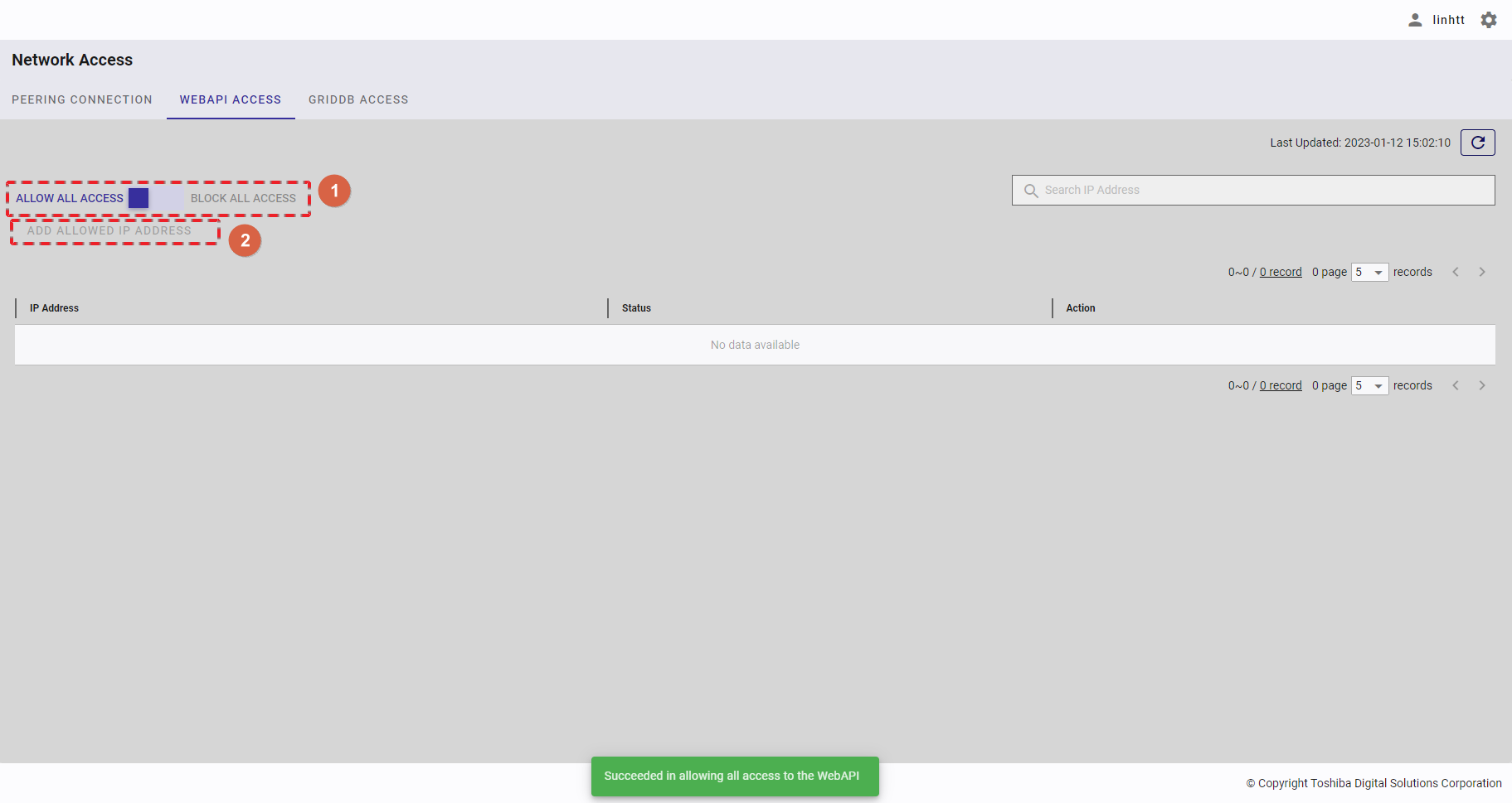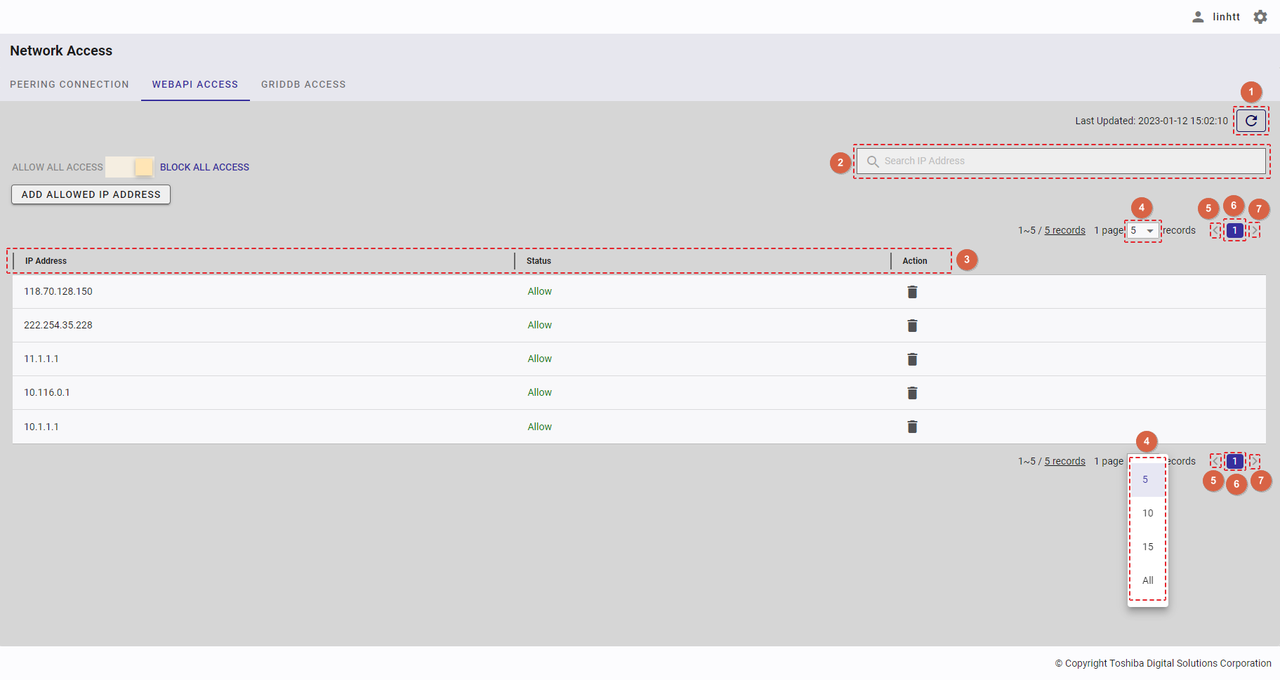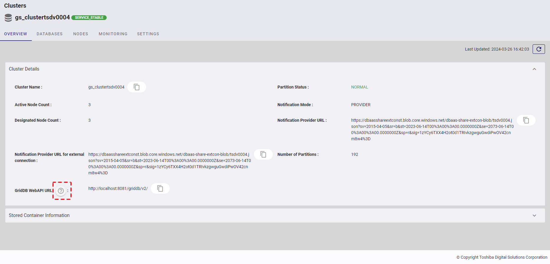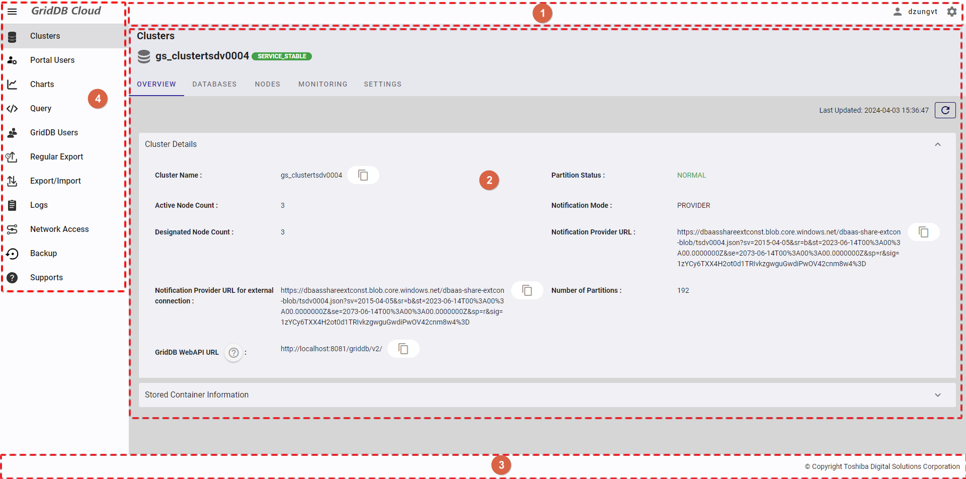 - GridDB WebAPI URL をクリップボードにコピーするには、 [Copy GridDB WebAPI URL] ボタン (⑤) をクリックします。