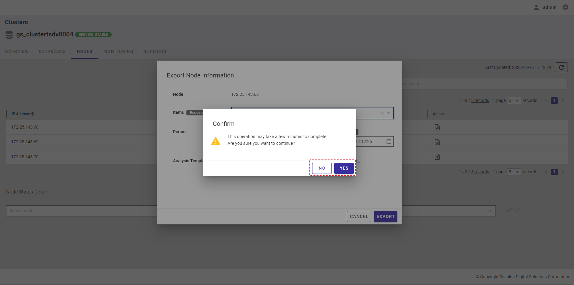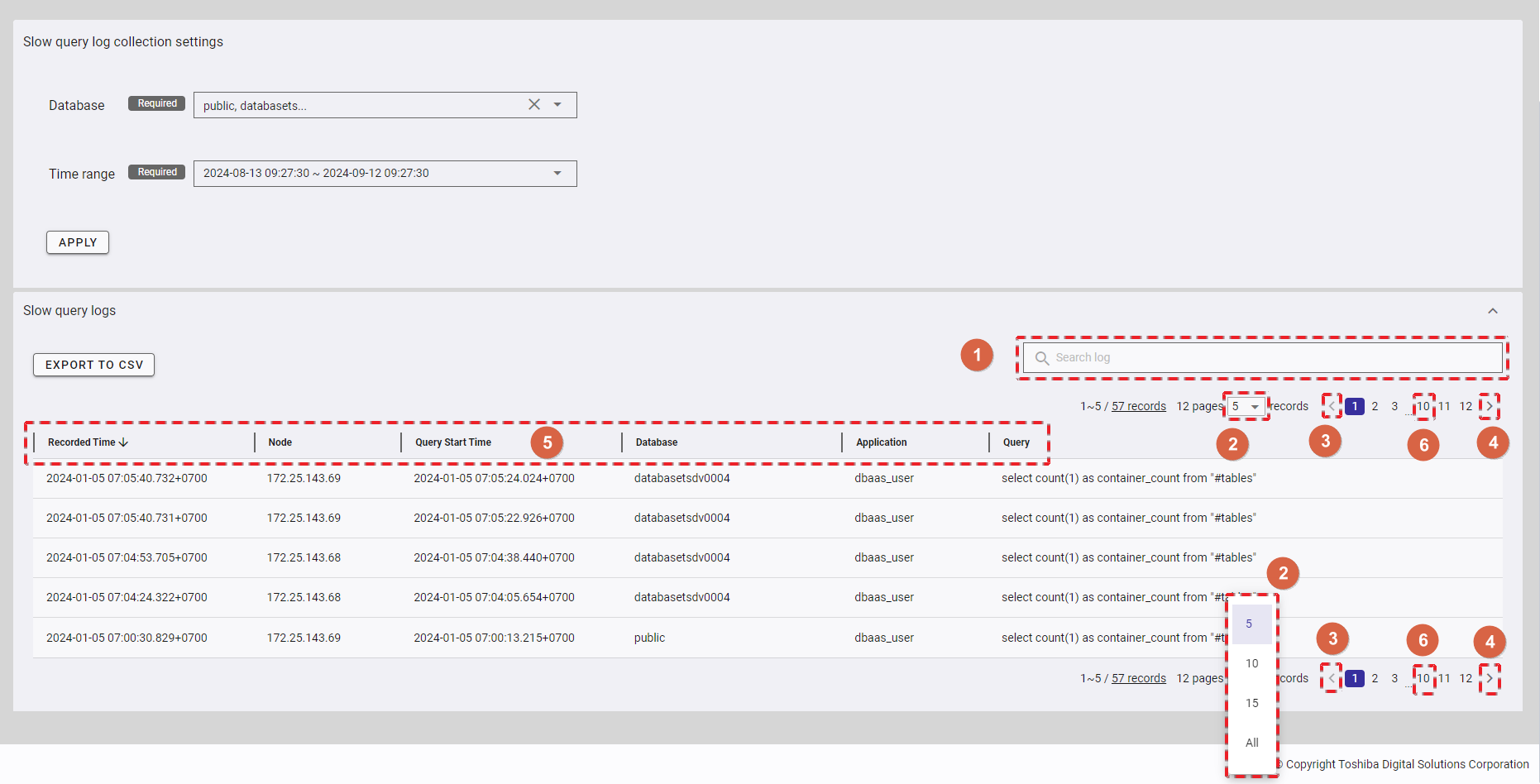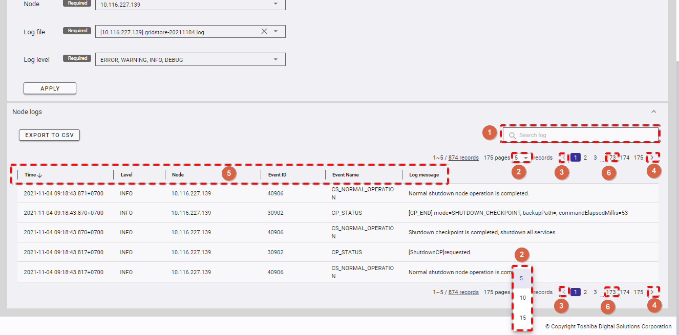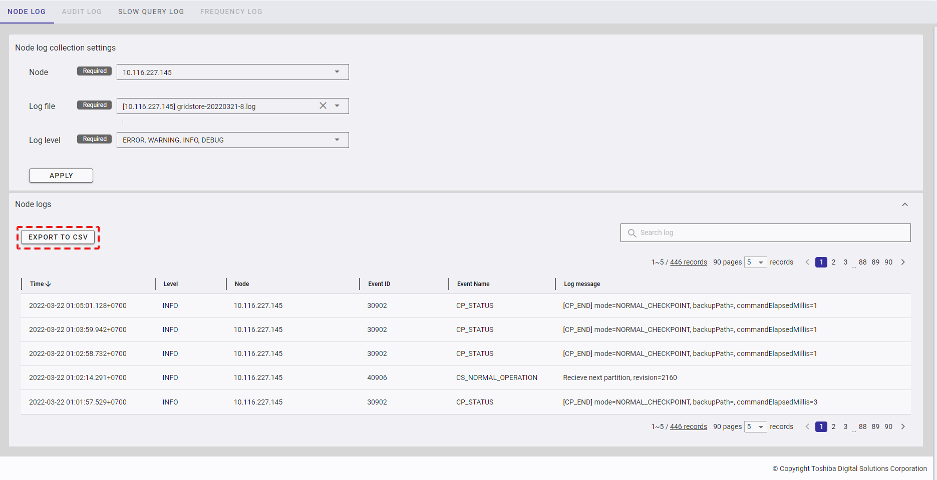 - 全ノードに対するすべてのログファイルまたは全データベースに対するすべてのログファイルを選択すると、大容量のログファイル一覧のロードには長時間を要するため、性能低下につながる恐れがあります。