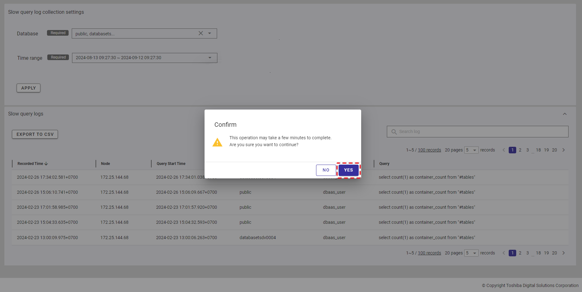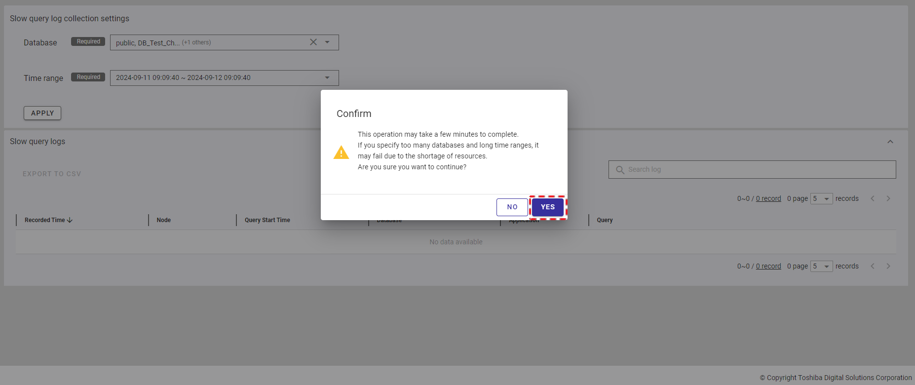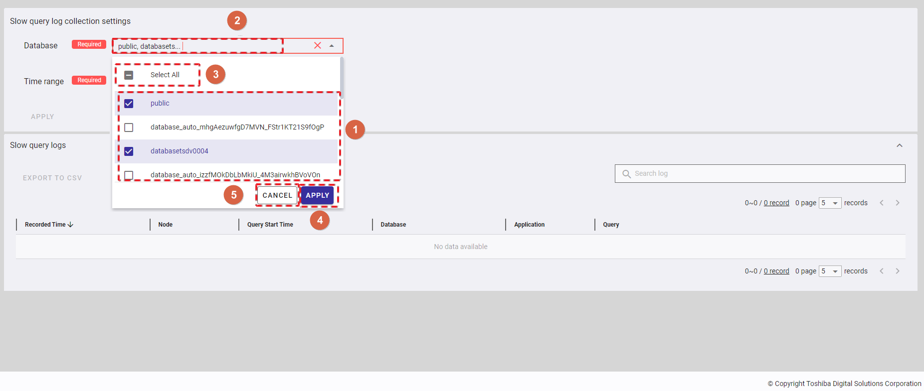 - 過度に多くのデータベースや長い時間範囲を選択すると、大きなログファイルリストのロードに時間を要するため、パフォーマンスが低下する可能性があります。エラーが表示された場合は、データベースの選択数を減らしたり、より短い時間範囲を選択してください。