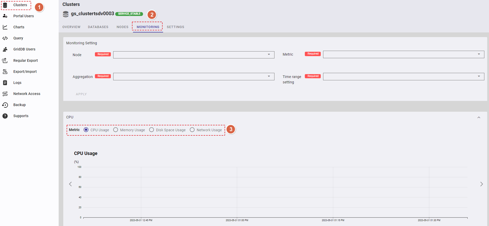 | 3 | Cluster monitoring | 監視データをグラフ形式で表示します。 | - | + |