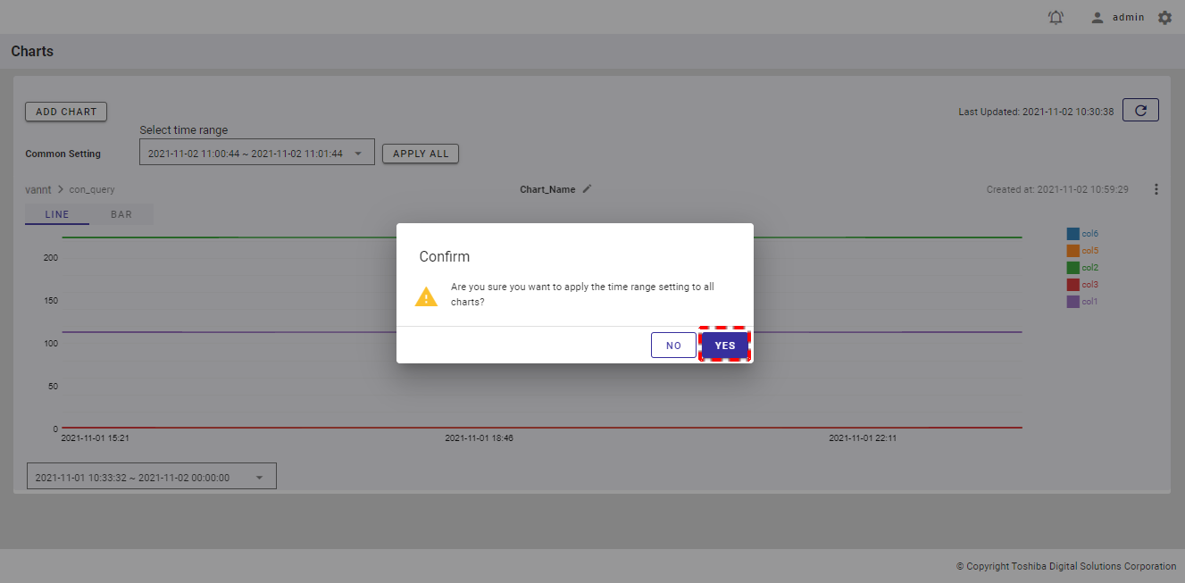 チャート一覧を参照する際(チャート一覧の表示を参照)、長いカラム名を持つチャートの場合、その凡例のカラム名表記は末尾が"..."となります。そのカラム名にマウスポインタを乗せるとカラム名全体が表示されます。