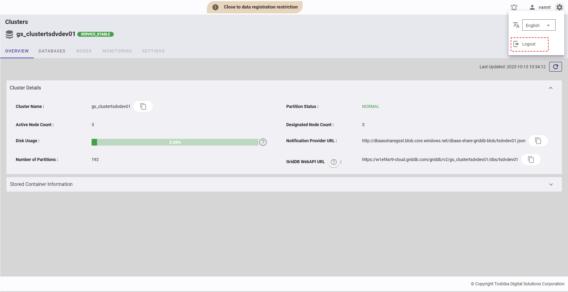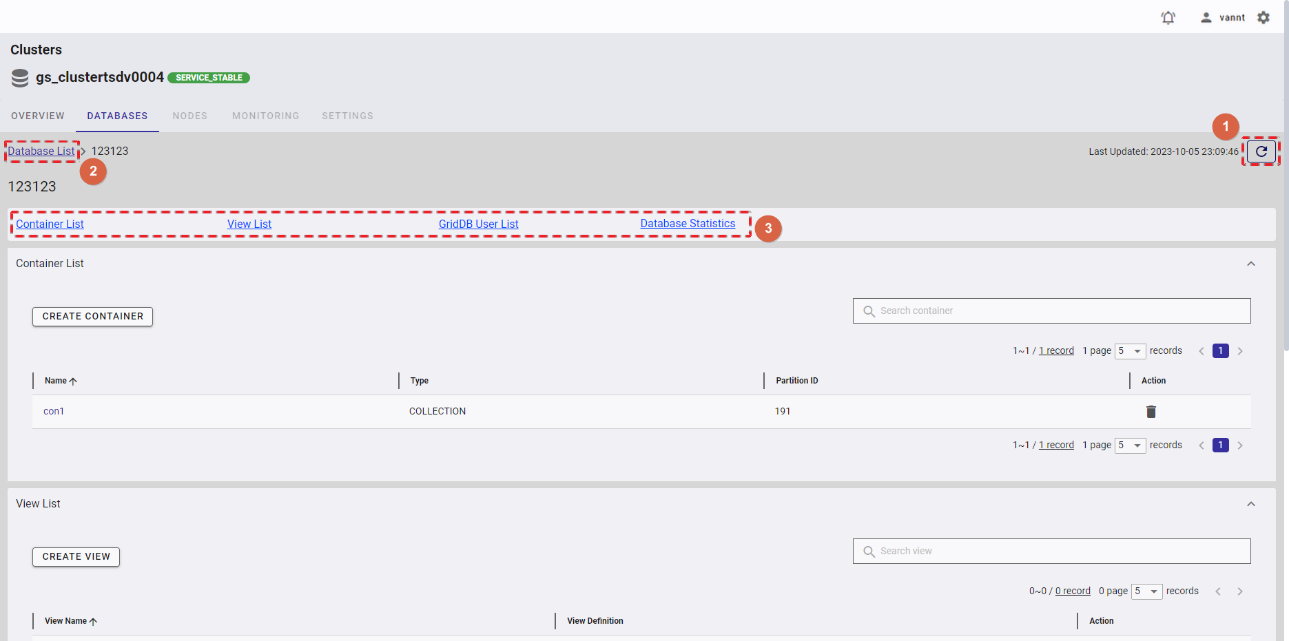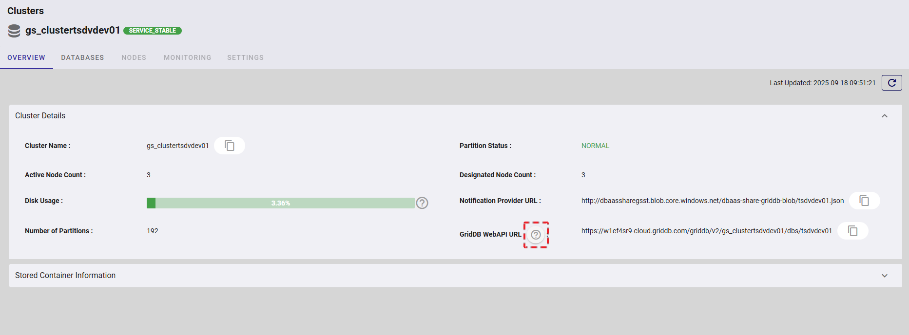 ステップ1: 左メニューから [Clusters] を選択し、クラスタ概要画面を表示します。[Stored Container Information] タブをクリックしてコンテナ情報の表示・非表示を切り替えます。クラスタにあるデータベースを選択し、そのデータベースのコンテナ情報を表示できます。
